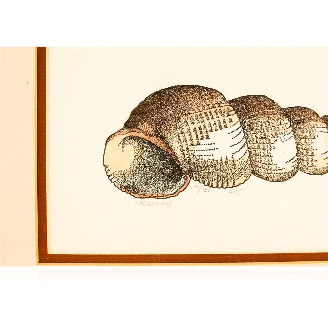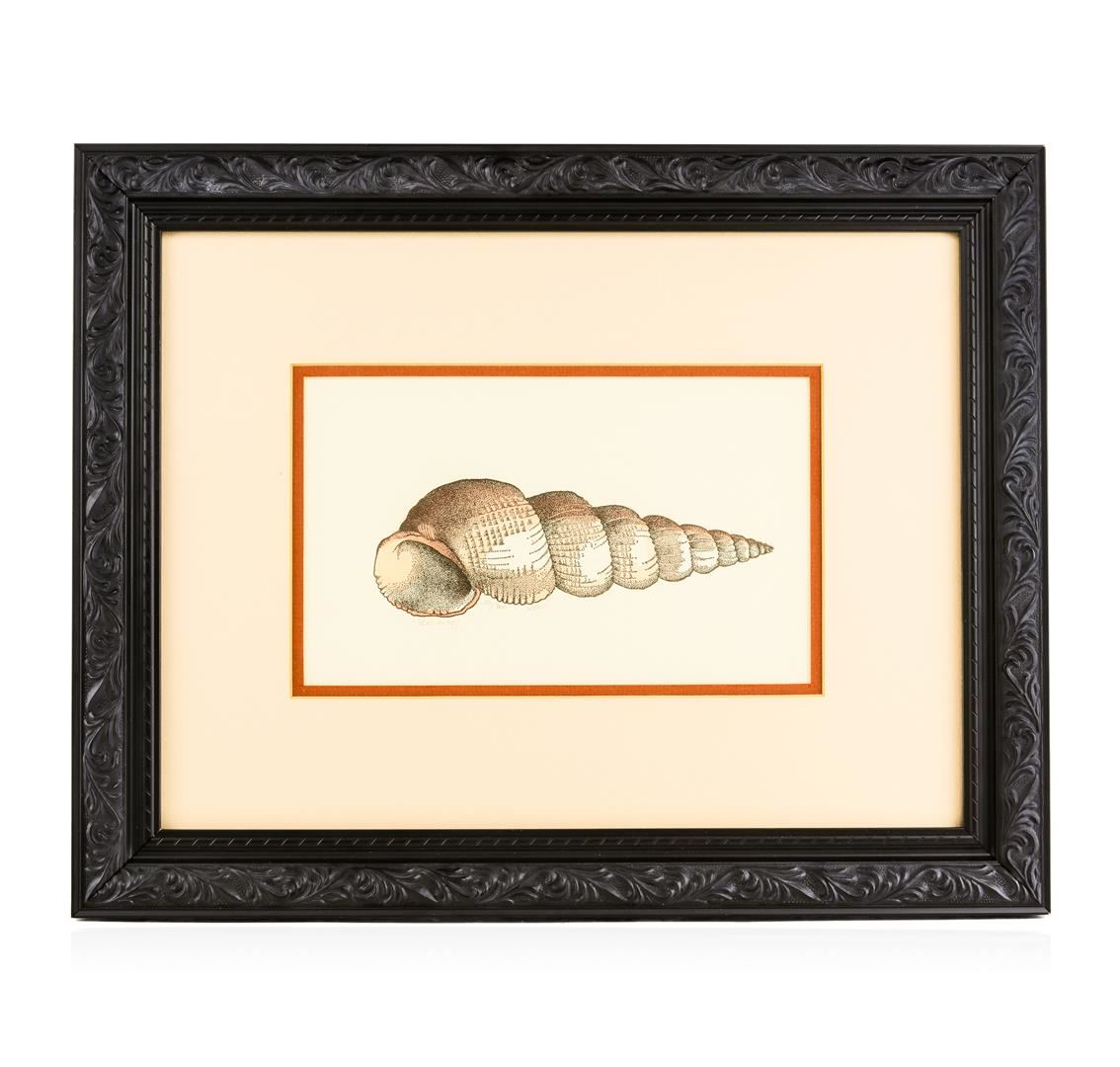 This is a lovely hand tinted etching of a sowerby shell by artist Leigh. It is signed, titled, and numbered in artist's hand. Numbered 07/300. Beautifully framed in a carved black frame. Double matted. Artwork measures 10" x 6". Frame measures 19" x 15".