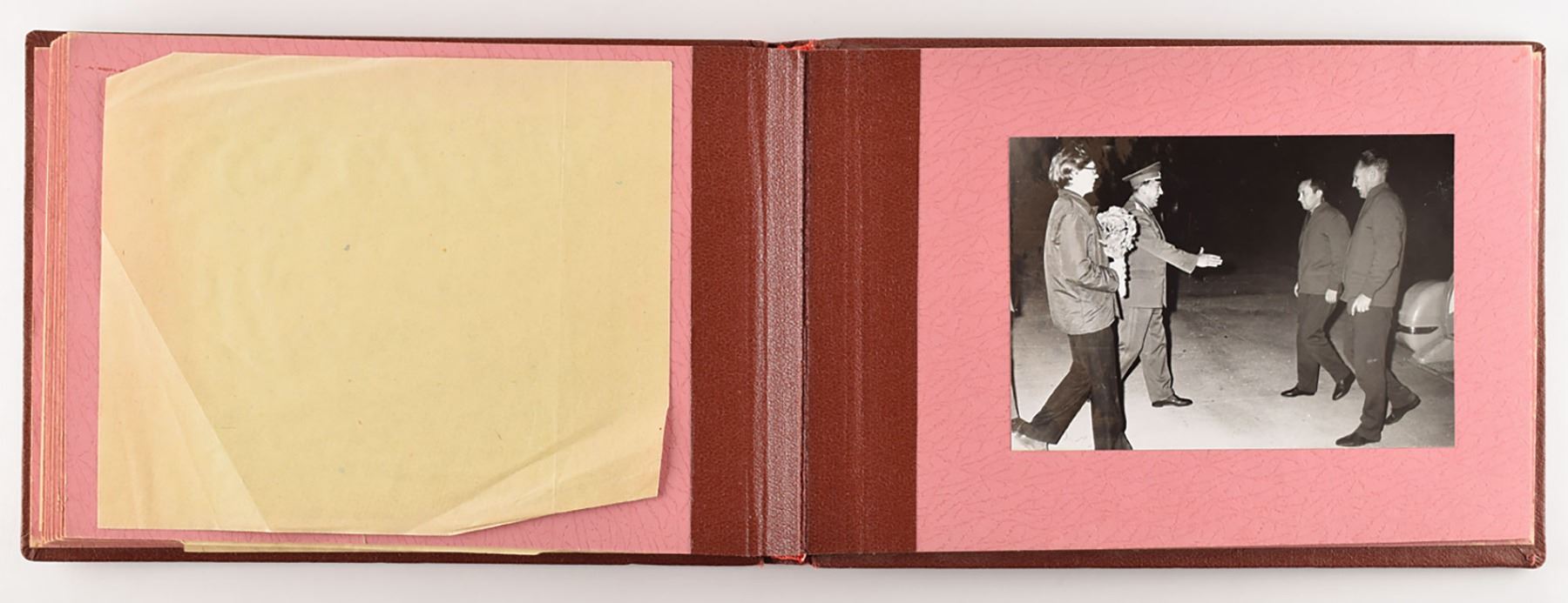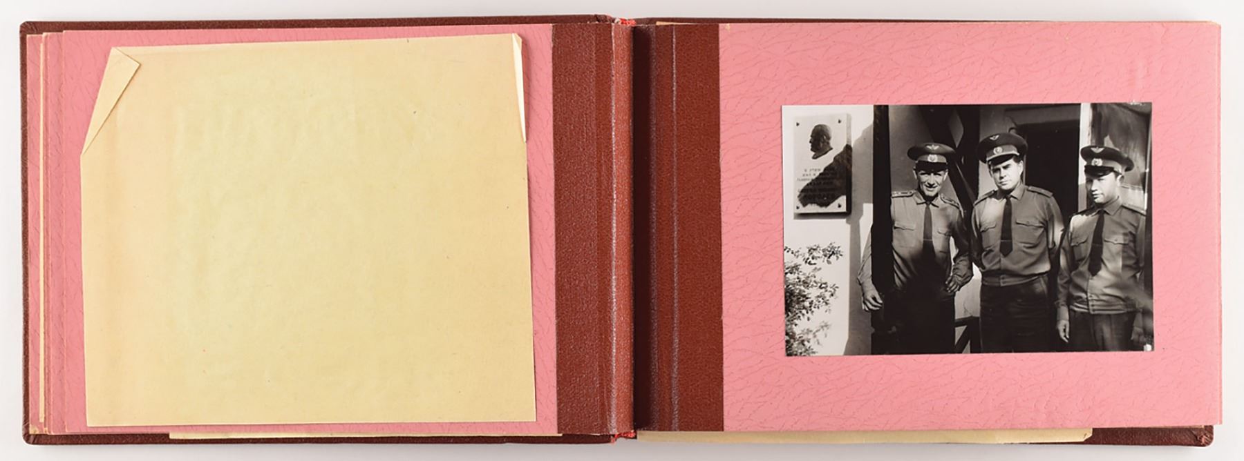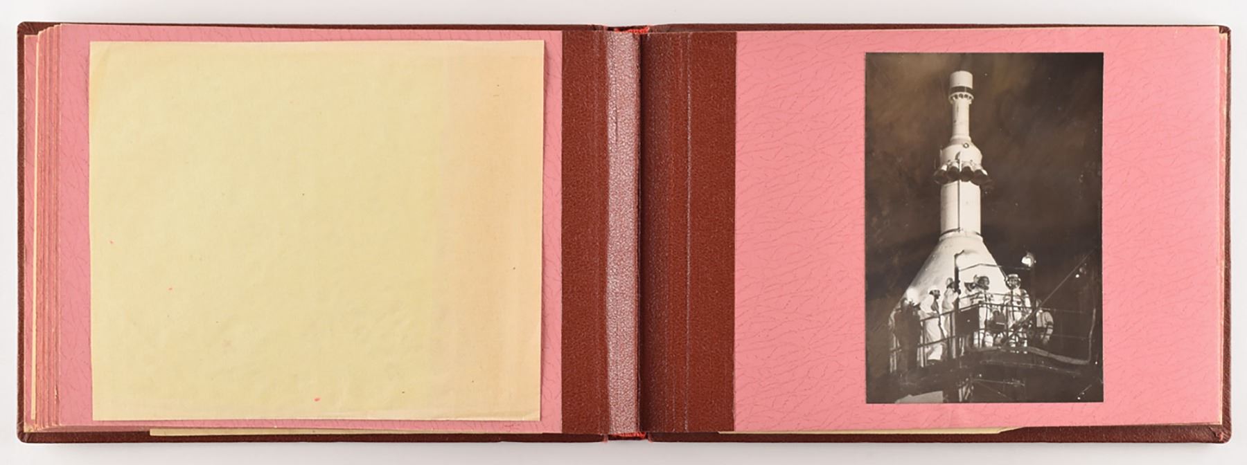 Uncommon grouping of 12 original glossy photos commemorating the historic flight of Soyuz 15, ranging in size from 4.5 x 6.25 to 8.75 x 5, each affixed inside a custom 11.75 x 8.25 presentation binder likely intended as a gift for a Soyuz team member. The majority of the photos include seldom-seen images of Commander Gennadi Sarafanov and Flight Engineer Lev Dyomin, with several showing them in their space suits prior to the mission. In overall fine condition, with wear to the album's covers. Intended to be the second mission to the Soviet Union's Salyut 3 space station, the Soyuz 15 mission had to be abandoned when the spacecraft was unable to dock due to an electronic malfunction in the Igla docking system.