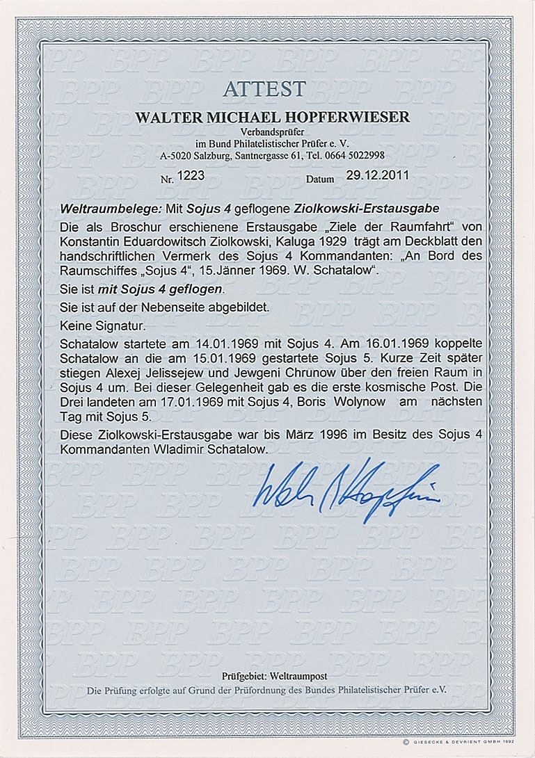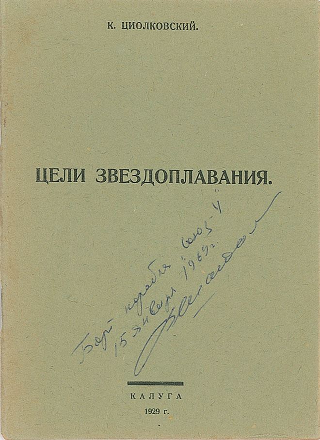 First edition of Konstantin Tsiolkovsky's paperback pamphlet entitled "The Purpose of Starflying," published in Kaluga in 1929, 5 x 7, 40 pages, carried into space on Soyuz-4, signed and flight-certified on the front cover in blue ballpoint by the mission commander, "Onboard the spacecraft Soyuz-4, 15 January 1969, V. Shatalov." In fine condition. Accompanied by a certificate of authenticity from Walter Michael Hopferwieser. Launched on January 14, 1969, Soyuz 4 performed the first successful docking of Soyuz spacecraft when it connected with Soyuz 5 on January 16th. A unique and very early flown piece from the Russian space program.