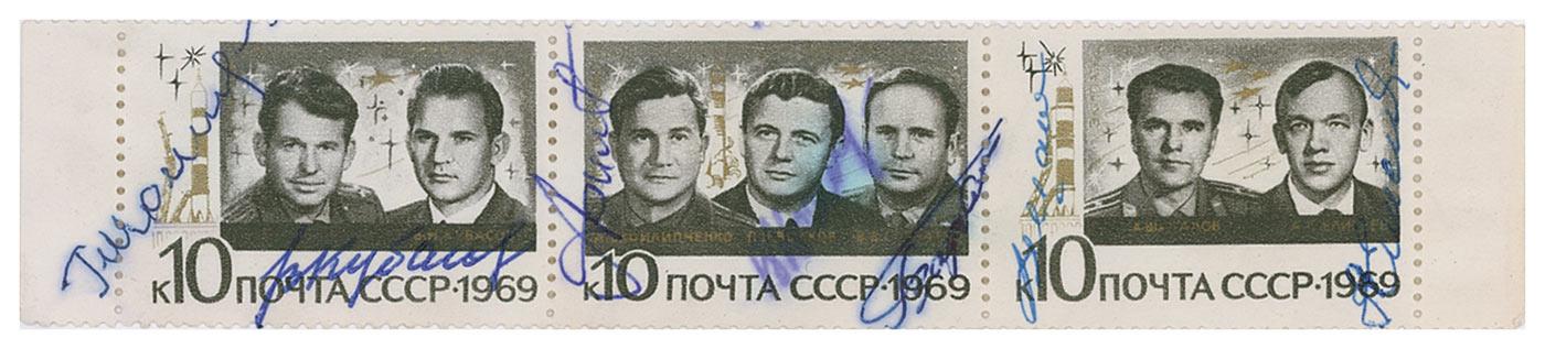 Strip of three Soviet commemorative postage stamps, 5.75 x 1.25, each signed in blue ink by the respective cosmonauts pictured. Signers are: Valery Kubasov and Georgi Shonin (Soyuz 6); Anatoly Filipchenko, Viktor Gorbatko, and Vladislav Volkov (Soyuz 7); and Vladimir Shatalov and Alexei Yeliseyev (Soyuz 8). In fine condition with bleeding to some of the signatures.