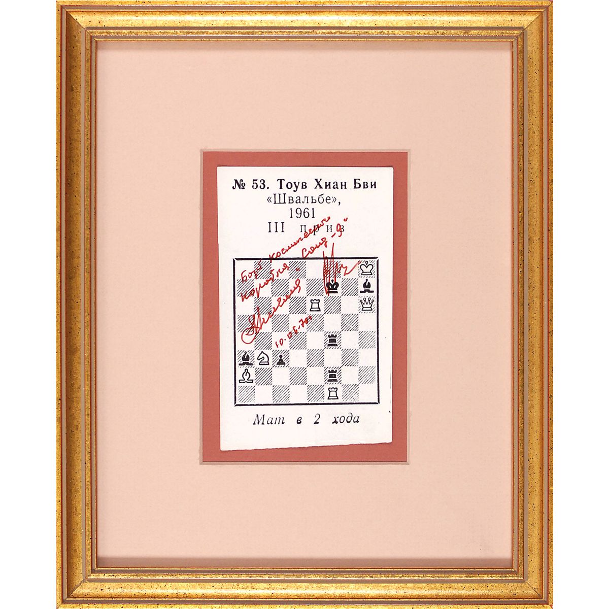 Glossy 3.25 x 5.25 photo of a chess board at move number 53, the winning move of Touv Chian Bvi, titled in Russian along the bottom, “Checkmate in 2 moves,” signed in brown felt tip by cosmonauts [Andrian Grigoryevich] Nikolayev and [Vitaly I.] Sevastyanov, with one adding (translated), “On board the space ship Soyuz 9,” and “June 10, 1970.” Matted and framed to an overall size of 9.5 x 12.75. In fine condition, with a couple of creases to the irregular bottom edge. The commander’s log book notes a game of chess was played with ground control during orbit number 144, and this photo may well be from part of that game.