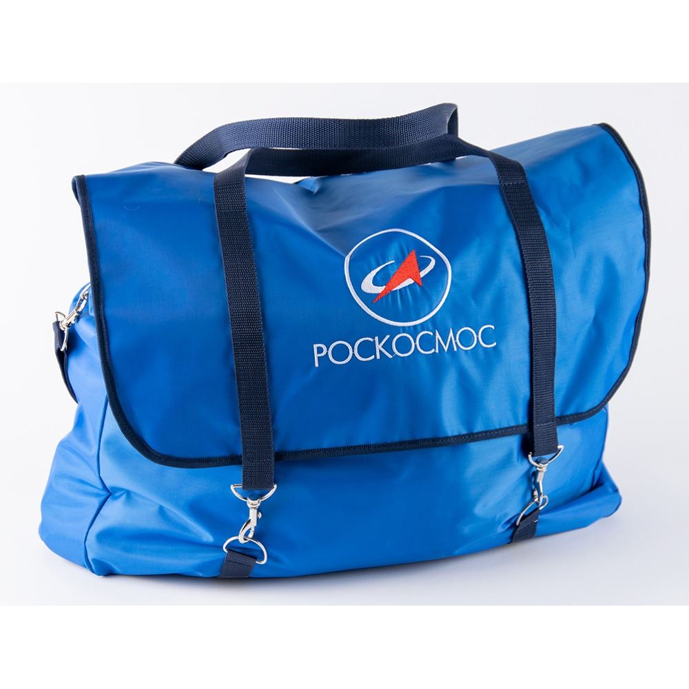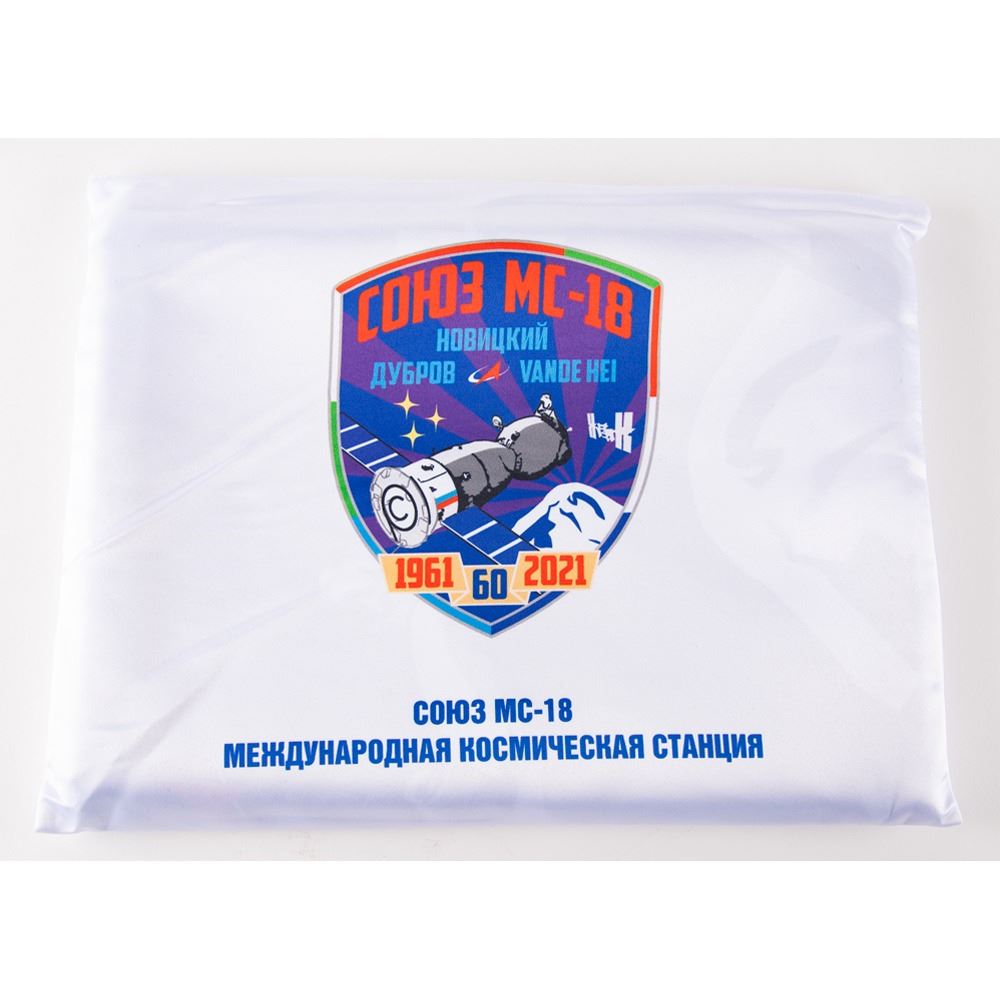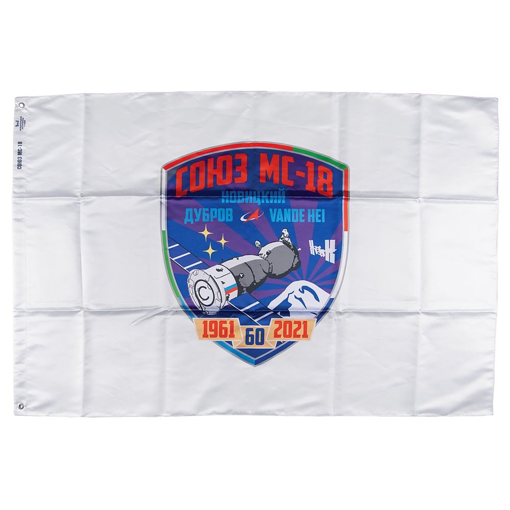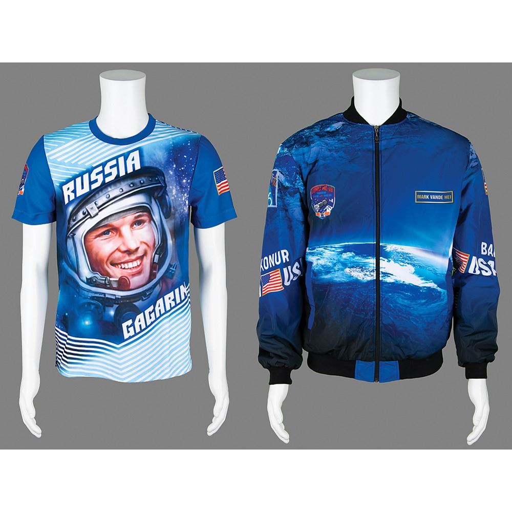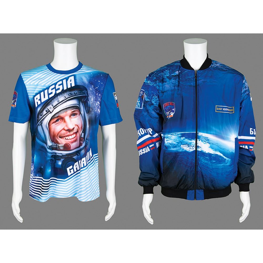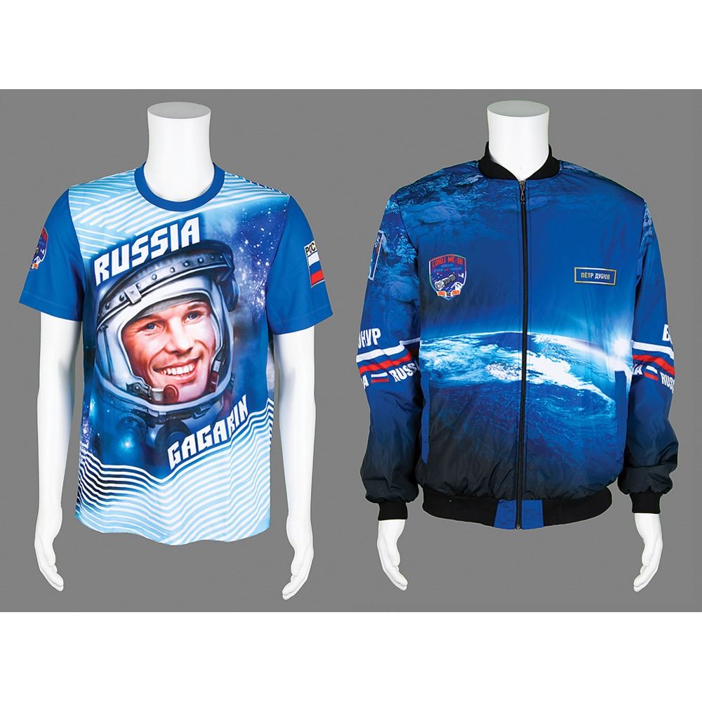 Impressive collection of (12) preflight items produced as spares for the crew of Soyuz MS-18 Expedition 64—Oleg Novitsky, Pyotr Dubrov, and Mark T. Vande Hei—composed of three ceremonial jackets and three jersey t-shirts, each of which was issued to the respective cosmonaut, whose name is printed in Cyrillic on the jacket’s upper left chest. The jackets feature the Russian flag, and the Soyuz MS-19 and Expedition 64 emblems, and each shirt bears a large image of Yuri Gagarin to the front and the back containing an image of the Vostok 1 and a quote from Gagarin in Cyrillic (translated): “I see the Earth! I distinguish the folds of the terrain, snow, forest…I observe the clouds…Beautiful! The beauty!” The seventh item is a ceremonial dual-sided flag for the mission, which measures 59 x 39. Each jacket-shirt combo, as well as the flag, is accompanied by its original carrying bag; all of the items are stored in a large ROSCOSMOS duffel bag. In overall fine condition.