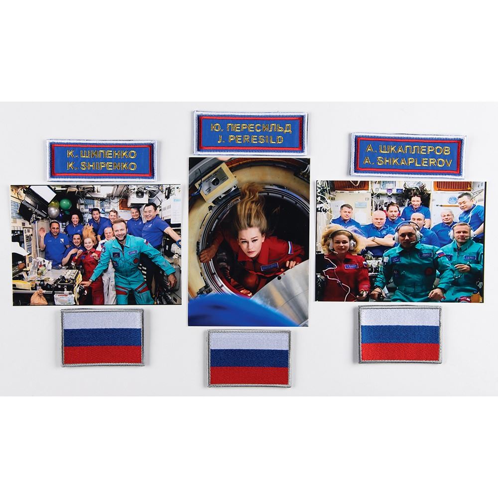 Collection of six spare name tags and Russian flag patches designed for crew members of the Soyuz MS-19 mission, which launched on October 5, 2021, marking the 147th flight of a crewed Soyuz spacecraft. The name tags were made for Commander Anton Shkaplerov, actress Yulia Peresild, and film director Klim Shipenko, the latter two being deemed flight engineers/space participants. Each embroidered name tag measures 4.5˝ x 1.75˝ and features the cosmonaut’s name in English and Cyrillic in beautiful gold thread, and the three Russian shoulder patches each measure 3.5˝ x 2.25˝; the reverse of each name tag and patch features male hoop Velcro. Includes three glossy photos of the crew wearing similar name tags and patches during the mission. In overall fine condition.