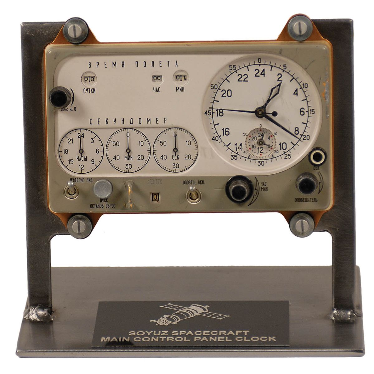 Flown Soyuz main control panel clock, measuring approximately 5.75 x 3.5 x 2, with a Soviet serial number on one side. Panel bears three small analog dials to measure hours, minutes, and seconds, a larger analog clock with a sweeping second hand and small hour dial set into the bottom, as well as three counter dials, two measuring hours and seconds, and several switches and knobs which can be used to set the dials. Clock is affixed to a vertical display stand measuring 6.5? high with a descriptive flag on the base. In fine condition, with expected wear and a few chips to right edge.