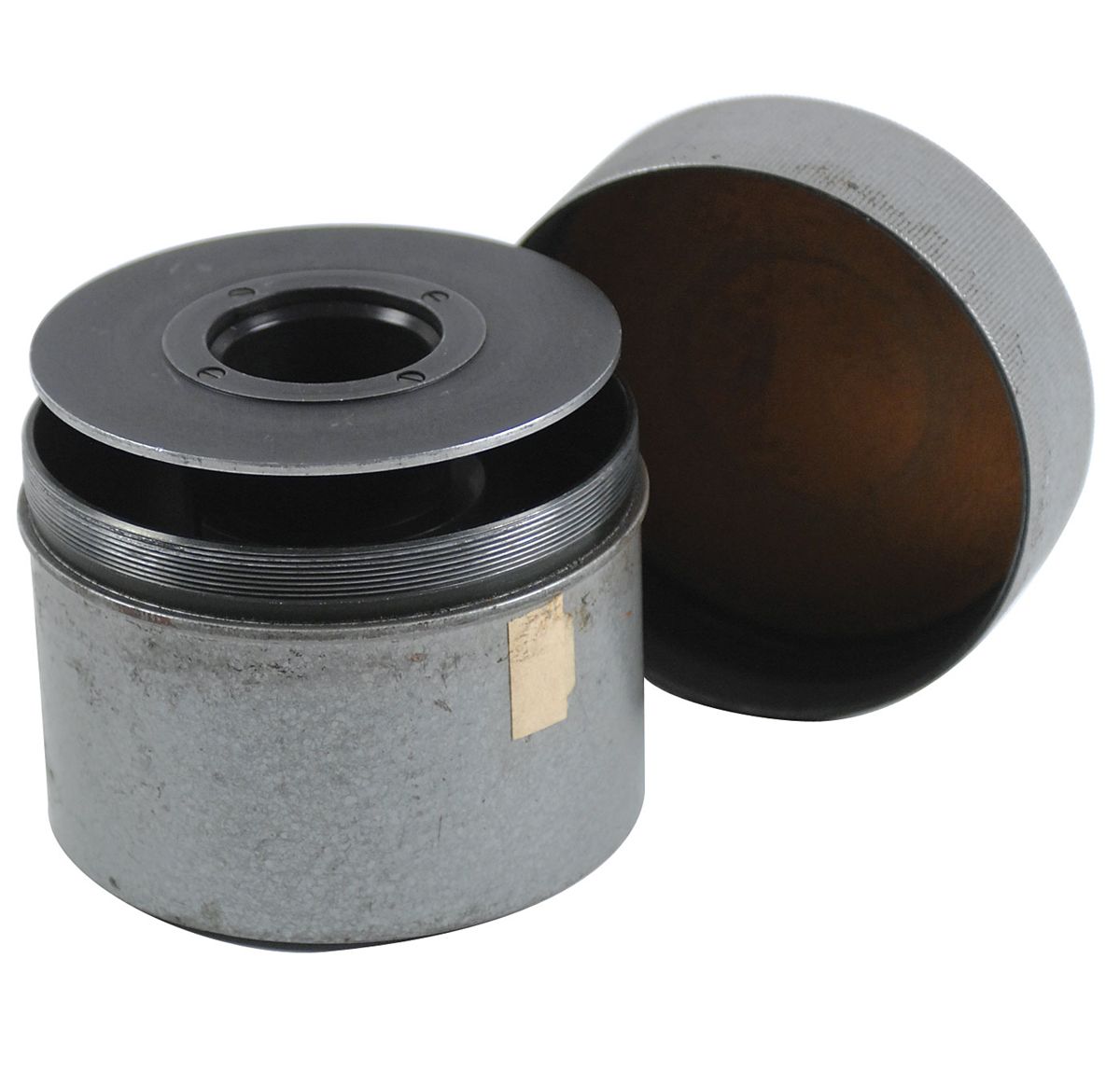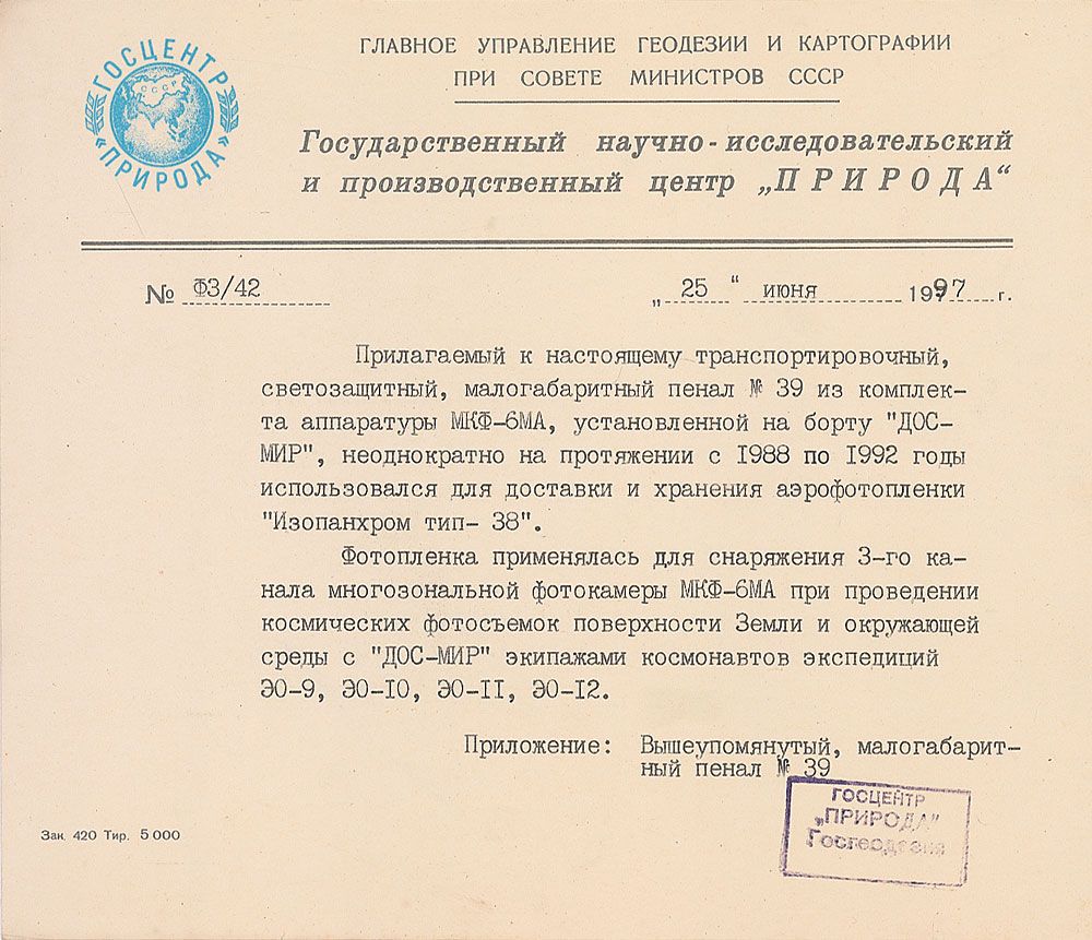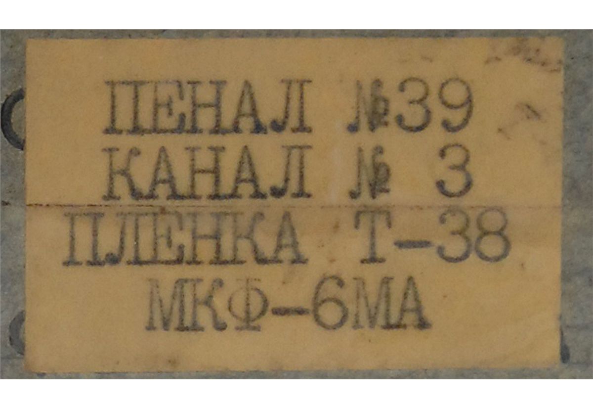Flown Russian light protective transporting canister, 3.5? high with a diameter of 4?, #39, used for the delivery and protection of film brought to and from the Mir space station. Includes the original metal film spool inside. Accompanied by a typed letter of authenticity, in Russian, on Federal Scientific-Research and Industrial Center letterhead, which reads, in part (translated): “Transporting, light-protective, small-dimension canister #39 from the complex of photo equipment MKF-6MA…was used many times during the period of 1988–1992 for delivering and keeping photo films ‘Izopankrome type-38’…used for equipping the 3rd channel of multizonal photo camera MKF-6MA during space photo shooting of the surface of Earth and surroundings from Mir by crews of cosmonauts from expeditions AO-9, AO-10, AO-11, AO-12.” In fine condition, with expected marks and wear from use.
