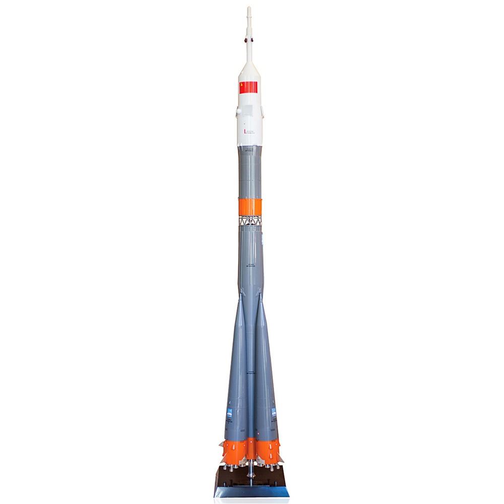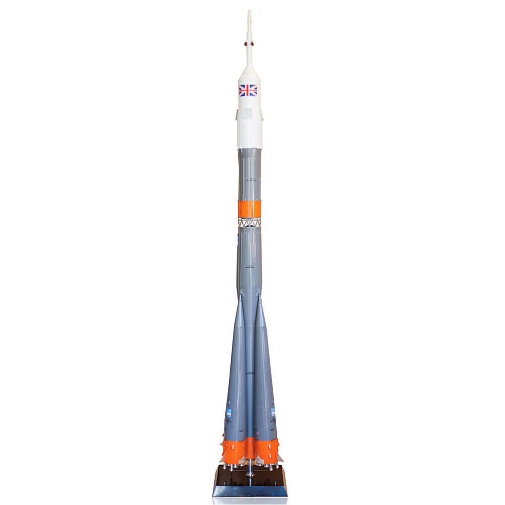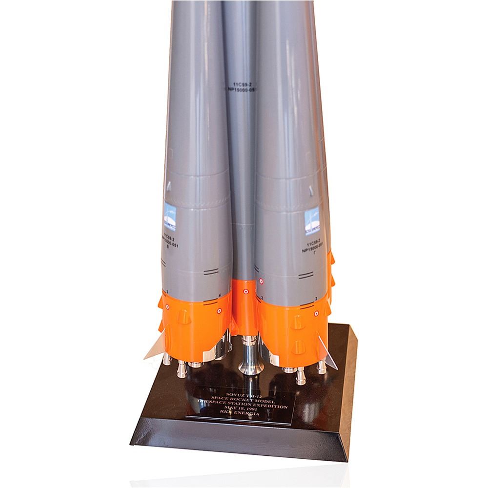 Magnificent 1:45 scale presentation model of a Soyuz TM-12 rocket. This custom handmade model, constructed of fiberglass, reinforced plastic, and metal, stands approximately 63è tall and is set on an attractive 10è x 10è base with descriptive plaque: "Soyuz TM‰ÛÒ12, Space Rocket Model, MIR Space Station Expedition, May 18, 1991, RKK Energia." The two-piece model separates at the second and third stage and is completed with the upper module and escape system engines, with the model featuring affixed Russian and British flags and several insignia logos. In fine condition. Soyuz TM-12 was the 12th expedition to Mir and it included the first Briton in space, Helen Sharman, who, along with Anatoli Artsebarski and Sergei Krikalev, spent 144 days docked to Mir. While it was in orbit, the failed coup d'Ì©tat against Mikhail Gorbachev in August 1991 rocked the Soviet Union, setting in motion events that led to the end of the Soviet Union on December 26, 1991.