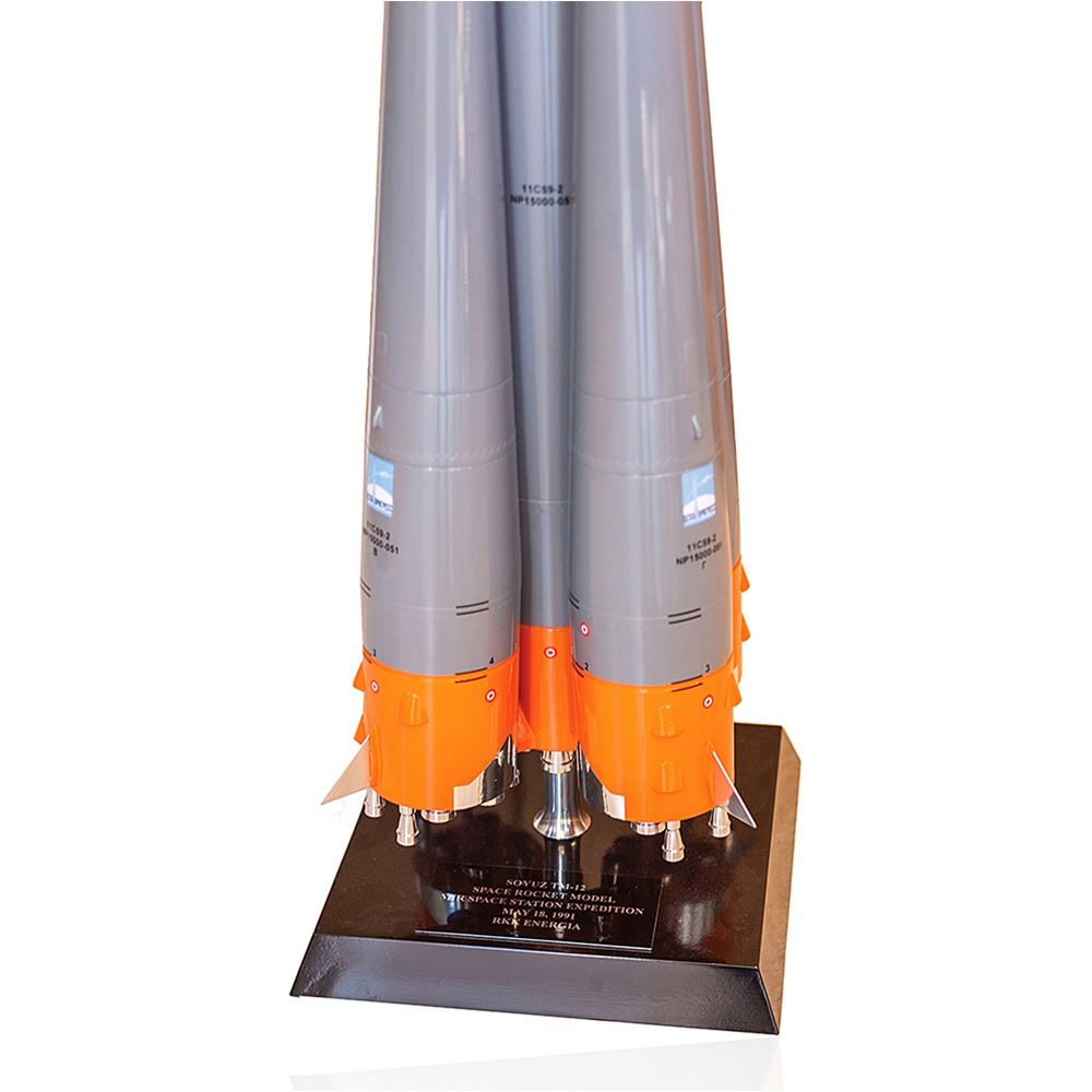 Magnificent 1:45 scale presentation model of a Soyuz TM-12 rocket. This custom handmade model, constructed of fiberglass, reinforced plastic, and metal, stands approximately 63Ë tall and is set on an attractive 10Ë x 10Ë base with descriptive plaque: "Soyuz TM–12, Space Rocket Model, MIR Space Station Expedition, May 18, 1991, RKK Energia." The two-piece model separates at the second and third stage and is completed with the upper module and escape system engines, with the model featuring affixed Russian and British flags and several insignia logos. In fine condition. Soyuz TM-12 was the 12th expedition to Mir and it included the first Briton in space, Helen Sharman, who, along with Anatoli Artsebarski and Sergei Krikalev, spent 144 days docked to Mir. While it was in orbit, the failed coup d'état against Mikhail Gorbachev in August 1991 rocked the Soviet Union, setting in motion events that led to the end of the Soviet Union on December 26, 1991.