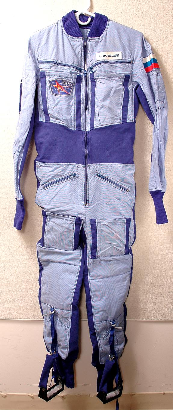 Soyuz TM-16, 1993, FLOWN "Penguin" Excercise Suit. This blue exercise suit was used by Alexander Poleshchuk while onboard MIR-13. The suit has a zip front with knit collar and cuffs. There are a series of elastic bands and stirrups integrated into the suit that provided resistance excercise to the astronaut during weightlessness. The suit is has Poleshchuk's nametag on the chest, a Zvezda patch on the chest and a Russian Federation flag on the left shoulder. An included printed instruction sheet, in Russian, was in the suit pocket during the flight. Poleshchuk has inscribed and signed it: "Flown on board "MIR" station".