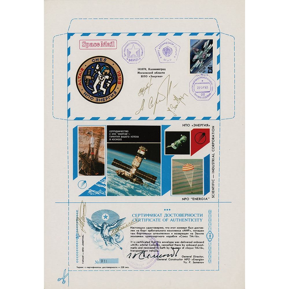 Flown board post cover carried to the Mir Space Station during the Soyuz TM-16 mission, which launched on January 24, 1993, 8.25 x 11.75, featuring cachets and imagery related to NPO Energia corporation and the CNES ALTAIR air-launch system, signed by Russian cosmonauts Vasili Tsibliyev, Aleksandr Serebrov, Aleksandr Kaleri, and S. Andreyev, and French astronaut Jean-Pierre Haignere. The bottom certificate of authenticity NPO Energia attests that this envelope was delivered to and postmarked onboard Mir and later returned to Earth by the crew of the Soyuz TM-16 transportation vehicle. The cover is numbered 206 and is signed by Yuri Semenov, the General Director/General Constructor of NPO Energia. In fine condition.