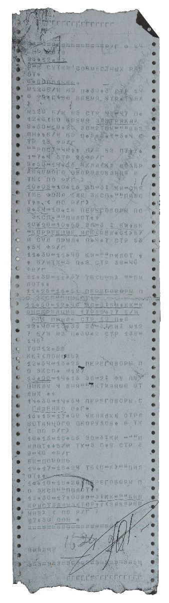 Flown Cyrillic telegram strip from Soyuz TM-2/Mir/Soyuz TM-4, 3 x 12.5, signed at the bottom by cosmonaut Yury Romanenko. The telegram contains the schedule and content of the TAYMIR (Romanenko and Alexandrov) and OKEAN (Titov, Makarov, and Levchenko) crews on December 28, 1987. The telegram was received through the STRELA (Arrow) telegraph. In fine condition, with expected wear and rough top and bottom edges. Accompanied by a photocopied letter of authenticity from Romanenko. From the collection of aerospace memorabilia specialist Ken Havekotte. Pre-certified Zarelli Space Authentication.