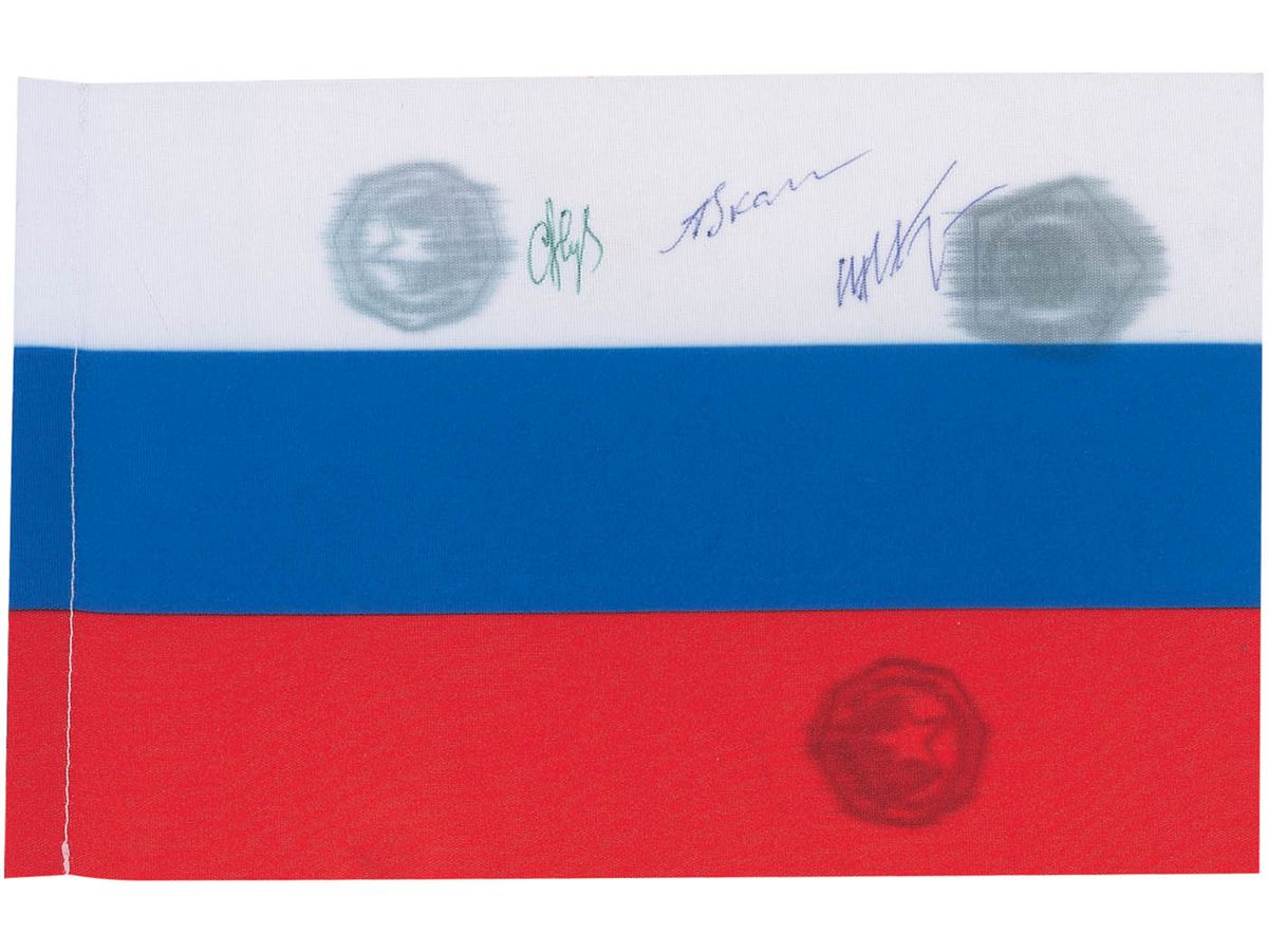 Flown printed fabric Russian flag, 7.25 x 4.5, carried aboard Soyuz TM-24 and the Mir space station, signed in blue and green ballpoint by cosmonauts Valery Korzun and Aleksandr Kaleri, and also signed by French astronaut Claudie Haigneré. Flag also bears three on-board space cancellations of Soyuz TM-24 and the Mir orbital complex. Accompanied by a 2004 certificate of authenticity, in Russian, on International Public Charitable Foundation for Support of Russian Cosmonautics letterhead from Shumkin Naum Andreevich. In fine condition, with moderate feathering and spreading to postmarks due to nature of the material. Provenance: Aurora Auctions; Fall 2006.