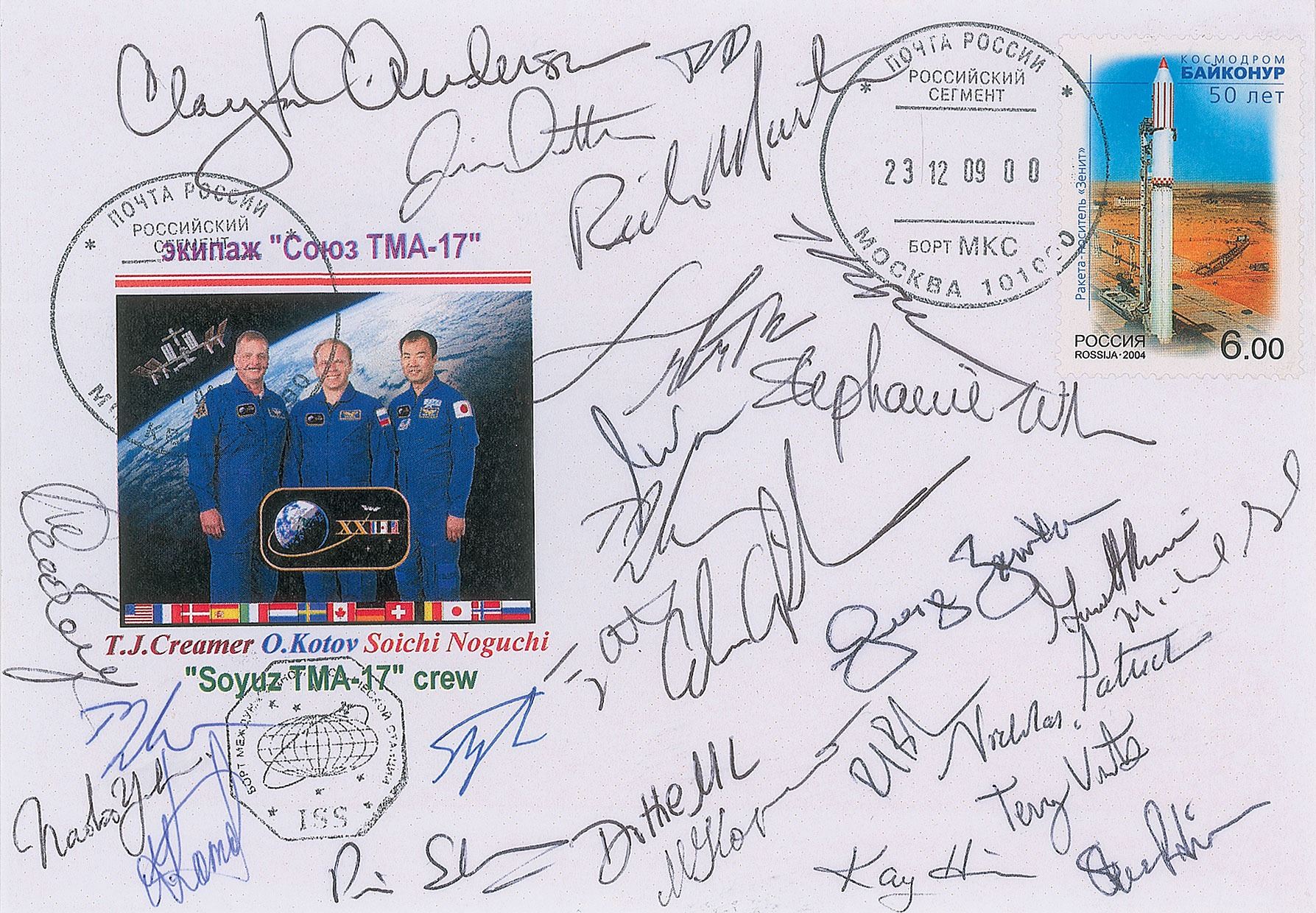 Flown cover carried to the International Space Station on Soyuz TMA-17, signed on the ISS in ballpoint by 28 astronauts, including the crews of TMA-17, STS-130, STS-131, STS-132, and TMA-18: Oleg Kotov, Timothy Creamer, Soichi Noguchi, George Zamka, Terry Virts, Kathryn Hire, Stephen K. Robinson, Nicholas Patrick, Robert L. Behnken, Alan Poindexter, James Dutton, Richard Mastracchio, Dorothy Metcalf-Lindenburger, Stephanie Wilson, Naoko Yamazaki, Clayton Anderson, Kenneth Ham, Tony Antonelli, Garrett Reisman, Michael T. Good, Stephen G. Bowen, Piers Sellers, Aleksandr Skvortsov, Mikhail Korniyenko, and Tracy Caldwell-Dyson. Also signed by Maksim Surayev and Jeffrey Williams from Soyuz TMA-16. In fine condition.
