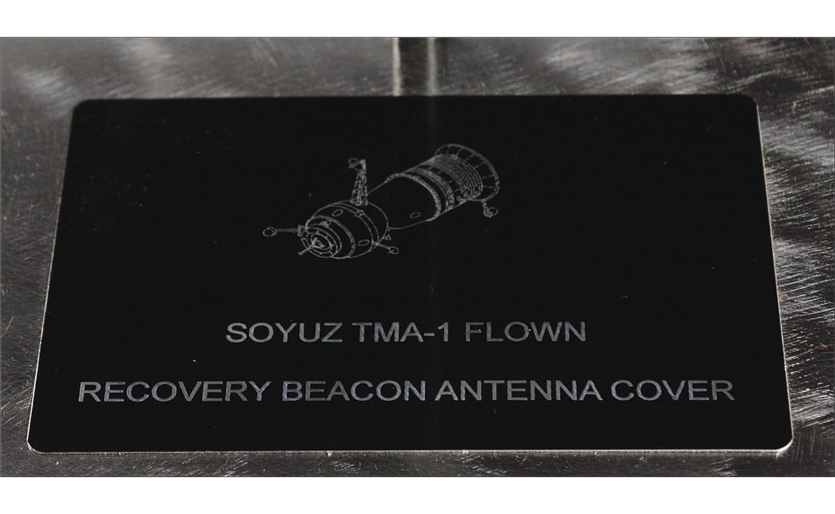 Flown recovery beacon antenna cover, flown aboard the Soyuz TMA-1 mission. Cover measures approximately 15? in diameter and is composed of ebonite and carbon fiberglass. Cover is screwed to a vertical mount that stands 34? high, with a plaque on the base. This cover was jettisoned after the successful landing of the spacecraft. This was the first flight of the new TMA-class Soyuz spacecraft, and the fifth mission to fly to the International Space Station.