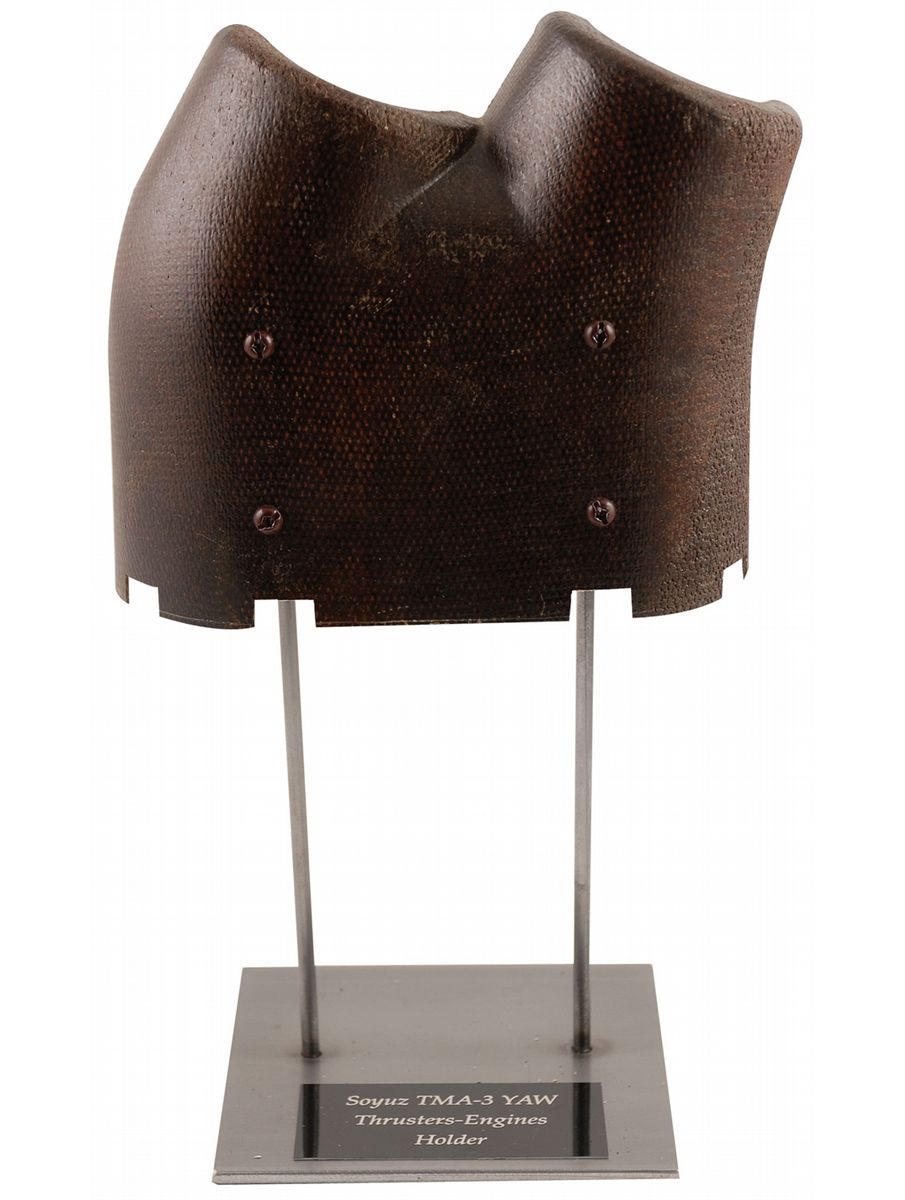 Flown Soyuz TMA-3 YAW thrusters-engines holder. Piece measures approximately 9 x 7 and is made of a composite of ebonite, carbon fiber, and glass. Piece is mounted to a vertical stand and base with a plaque that reads, “Soyuz TMA-3 YAW Thrusters-Engine Holder.” This piece was part of the Soyuz spacecraft Thermal Control Protection System, which was essential to the protection of the craft and crew during reentry.