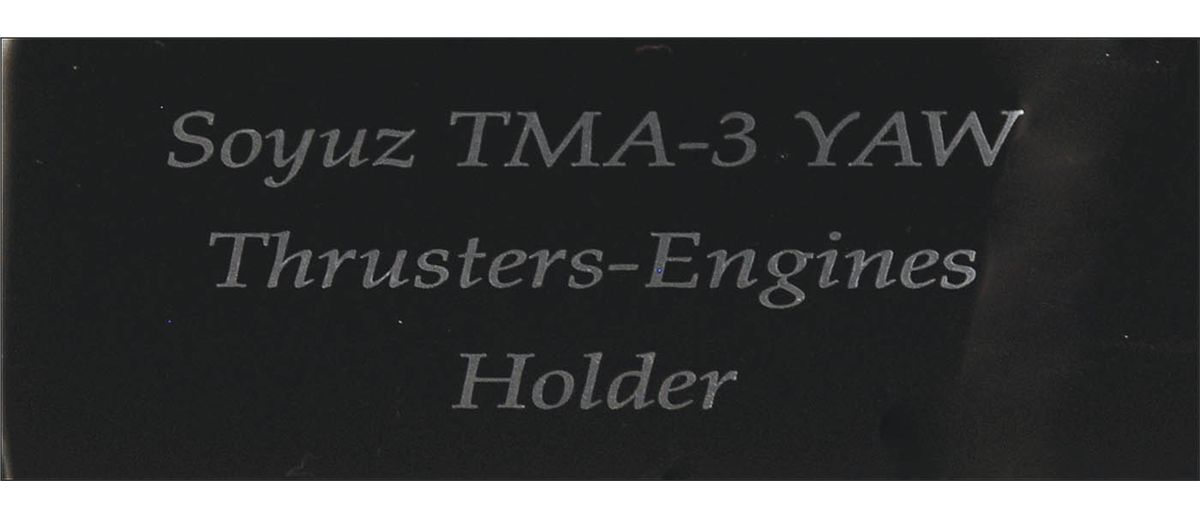 Flown Soyuz TMA-3 YAW thrusters-engines holder. Piece measures approximately 9 x 7 and is made of a composite of ebonite, carbon fiber, and glass. Piece is mounted to a vertical stand and base with a plaque that reads, “Soyuz TMA-3 YAW Thrusters-Engine Holder.” This piece was part of the Soyuz spacecraft Thermal Control Protection System, which was essential to the protection of the craft and crew during reentry.