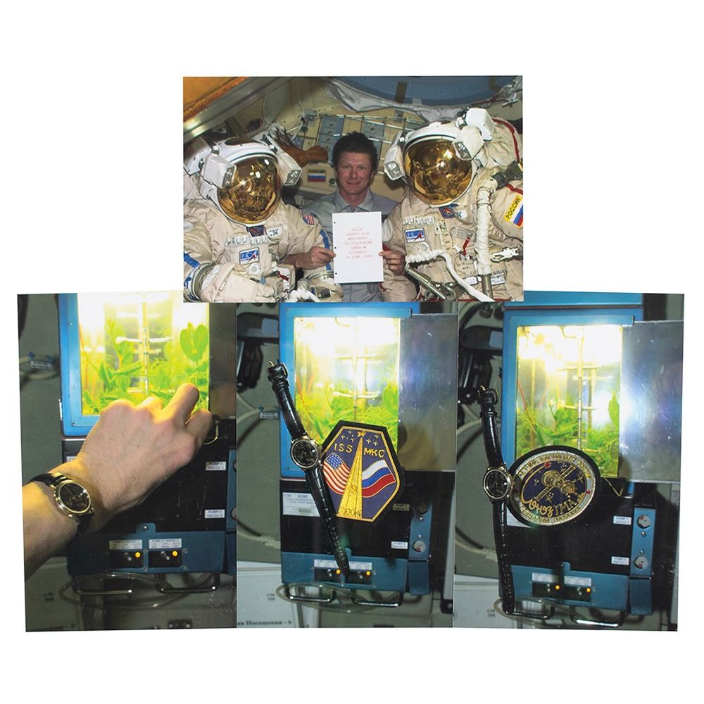 Flown Russian Poljot wrist watch carried to the International Space Station aboard Soyuz TMA-4 for Expedition 9. The watch was carried by Gennady Padalka to commemorate Russian space achievements. The face of the watch depicts a starry background with five early Soviet satellites, like Sputnik and the Molniya 1. The caseback is engraved with the model number "220011," and mission information in Cyrillic (translated), "Soyuz TMA-4, ISS-9, 2004." The timepiece remains on its original black leather watchband, and includes its original plastic transferal bag, and two handmade patches with gold wire bullion designs commemorating the mission, all of which were flown on the ISS. In fine condition, with a bend to watchband and a crack to the crystal. Accompanied by numerous photos of the watch onboard the International Space Station, as well as two additional photos signed in felt tip by Gennady Padalka.