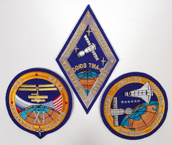Soyuz TMA-6/ISS-11, 2005, FLOWN Crew/Mission Patches. Lot of three different, 4" patches, including a Soyuz TMA-6 patch, an ISS-13 patch and a Cosmonaut S. Krikalev Personal Mission patch. Each includes a printed certificate of authentication that reads, in part: "This is to certify that the accompanying…patch did, indeed fly with the on Soyuz TMA-6 to the International Space Station during Expedition ISS-11…". Each certificate is hand-signed by Mission Commander Krikalev. A rare, attractive group.