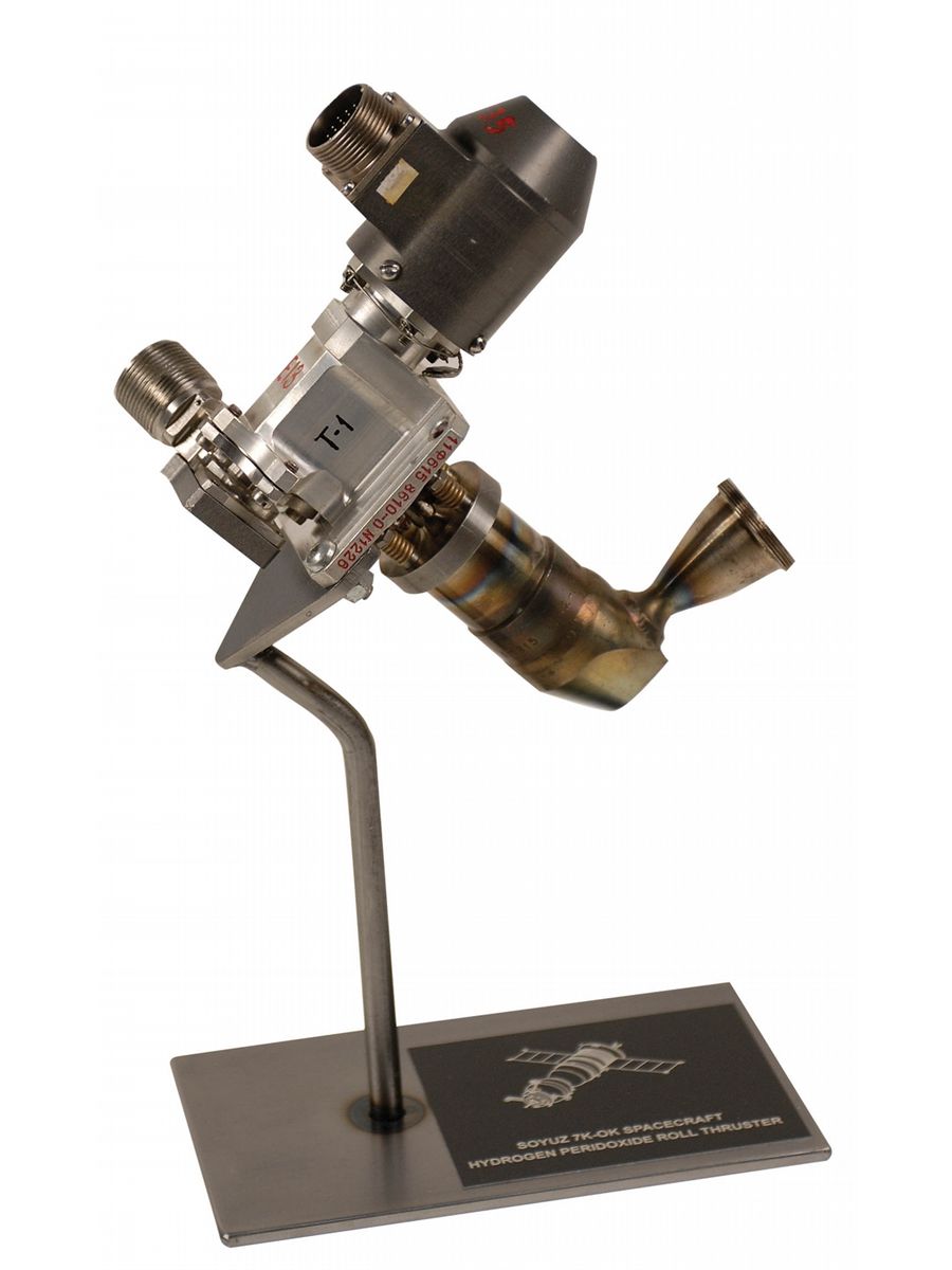 Used Hydrogen Peroxide Thruster engine, 9 x 6 x 1.5, used on one of the Soyuz 7K-OK spacecrafts (1966–1971). Capsules of this design were used for the first ferry flights in the Salyut space station program. This thruster was one of the key components of the Orientation and Attitude Control Maneuvering engine. The thruster is complete with fuel assembly and shows the rainbow effects on the metal of numerous firings. Each part bears engraved identification numbers. Engine is affixed to a vertical display stand measuring 14” high, with a descriptive plaque on the base. In fine condition, with expected wear from use.