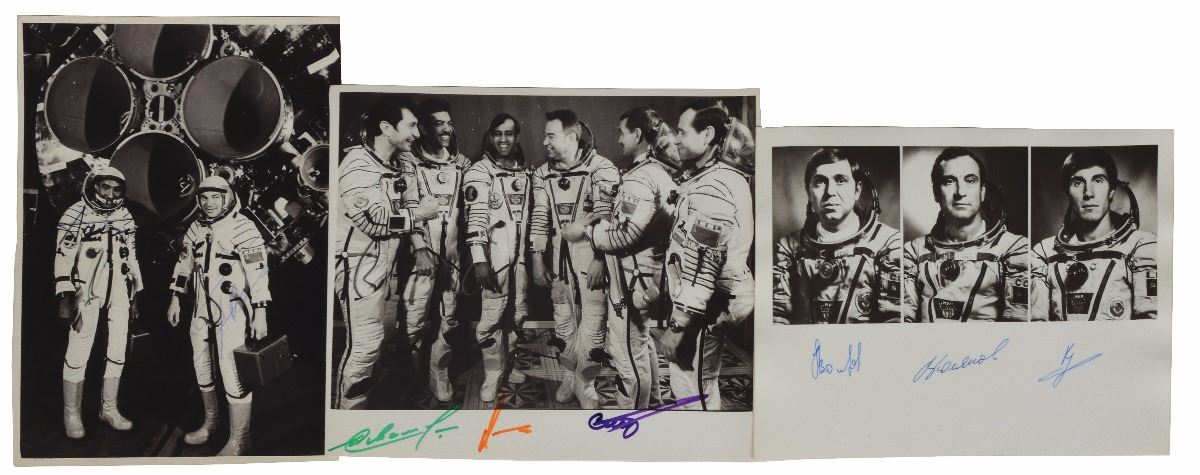 Three signed photos: a matte-finish 9.5 x 7 photo of the Soyuz TM-7 crew, signed in blue ink by Alexander Volkov, Sergei Krikalyov, and Valeri Polyakov; a matte-finish 7 x 9.5 photo of Arnaldo Tamayo Mendez and Georgi Grechko, signed in ink by both; and a glossy 9.5 x 8 photo of Soyuz TM-11, signed in felt tip by Gennadi Strekalov, Yuri Malyshev, and Rakesh Sharma. In overall very good to fine condition, with trimming to one and scratches to top of another photo. From the collection of aerospace memorabilia specialist Ken Havekotte. Pre-certified Zarelli Space Authentication.