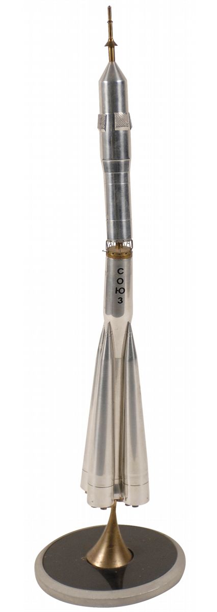 Scale model of a Soyuz space craft made by the Samara factory. Model measures 13.5? tall and screws in to a vertical base with an overall height of 15.75?, and upper half of model having been assembled at an angle. In fine condition, with light wear to circular base.