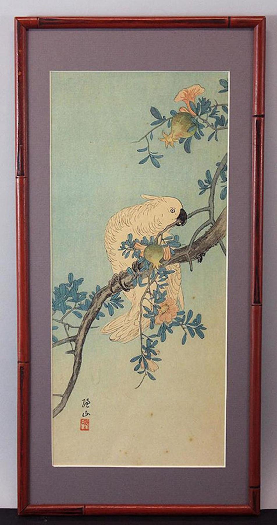Sozan Ito (1909-1926) - Parrot On A Pomegranate. framed under glass in 9 ¼” by 18 ½” painted wood frame. This item is being advertised unframed on the internet for $1400. Sozan Ito was active from 1909 to 1926 while working for the publisher Watanabe. His style is based on traditional Japanese woodblock printing, while his content centers almost exclusively on the delicate study of birds and flowers. FINE CONDITION