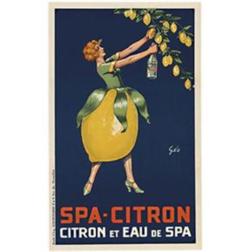 Original Spa Citron vintage poster. Citron et Eau de Spa. Linen backed. Excellent condition. Fun image of a woman whose body is a lemon as she is picking lemons from the tree to create the Spa - Citron... Citron et eau de spa! A great image for any upscale kitchen or dining area.
