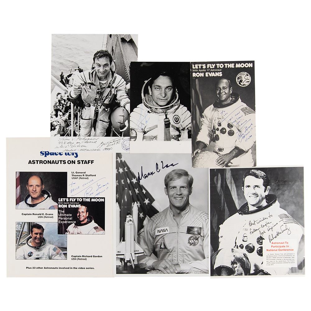 Six items signed by astronauts and cosmonauts, ranging in size from 5 x 7 to 8.5 x 11, including: Ron Evans (two flyers), Richard Truly (magazine clipping), Mark C. Lee (SP), Valery Bykovsky (SP), and Valeri Polyakov (SP). In overall very good to fine condition, with creasing to the Truly.