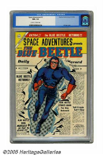 <B>Space Adventures #13 (Charlton, 1954) CGC NM+ 9.6 Off-white to white pages.</B></I> The Blue Beetle returns in this issue -- it's the original Golden Age character, Dan Garrett (in fact the content is reprinted from Fox's <B>Blue Beetle</B></I> #59). We believe this to be the first Charlton superhero comic, and that's a bit surprising in light of the cover date, putting it squarely in that pre-Silver Age era when superheroes were out of vogue. This issue's cover is by Al Fago. Overstreet 2005 NM- 9.2 value = $170. CGC census 7/05: 4 in 9.6, none higher.