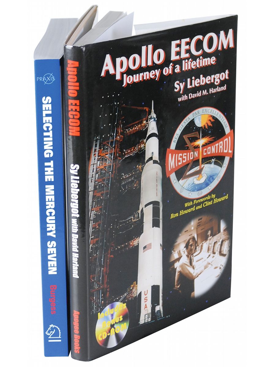 Two first edition books: first, a hardcover copy of Apollo EECOM: Journey of a Lifetime, signed by Sy Liebergot and accompanied by a color 7 x 5 satin-finish photo of Liebergot at his post during Apollo 13, signed in black felt tip; and second, a softcover copy of Selecting the Mercury Seven, signed by Colin Burgess, and accompanied by a 2011 presentation of seven 1959 Mercury candidates. In fine condition.