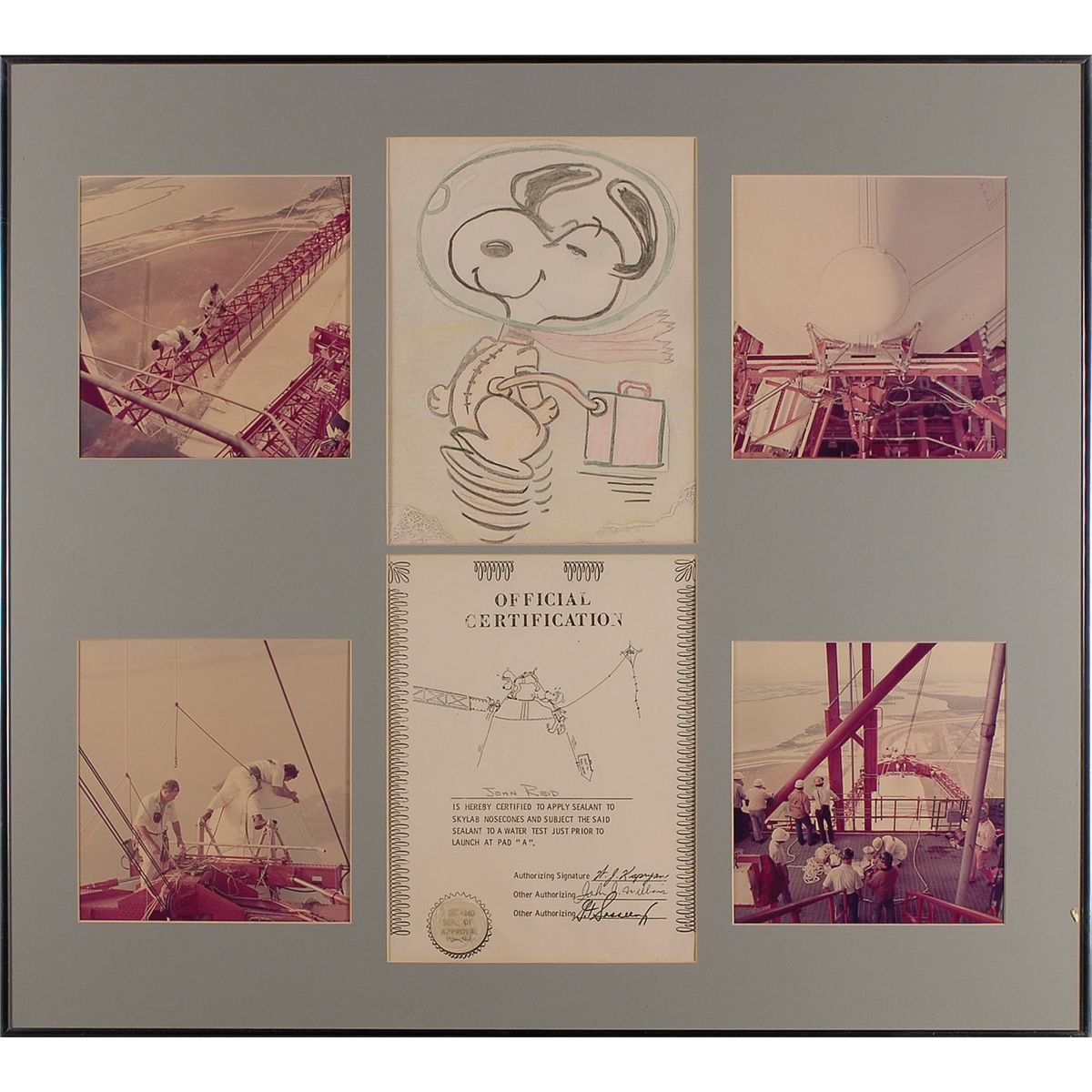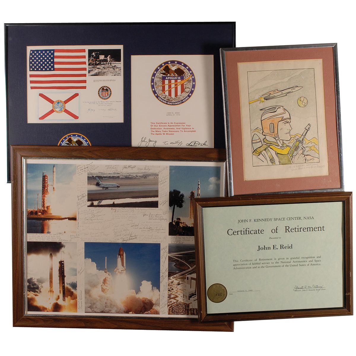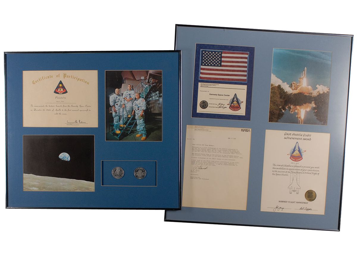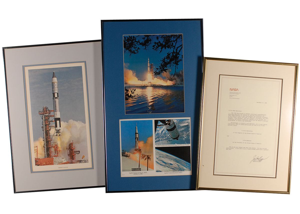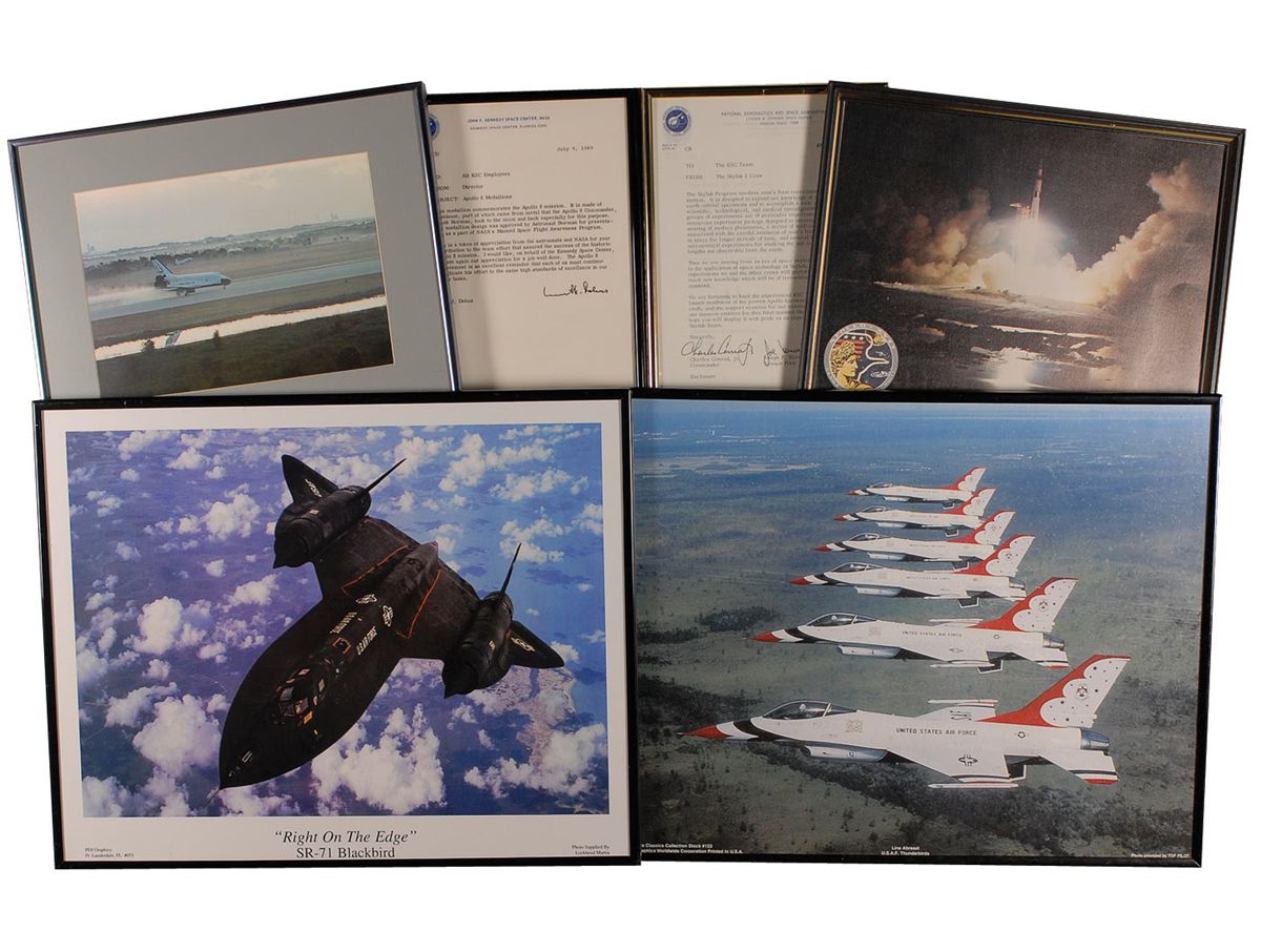 Remainder of the items are housed in 23 individually frames of various sizes and include unsigned photos, NASA letters and memos (with printed signatures), and assorted commendations and certificates of appreciation (also with printed signatures). Some of the items include: a February 11, 1986, memo from Director R. G. Smith sent out after the Challenger explosion; a large display with a color image of Snoopy and a humorous certificate stating Reid is “certified to apply sealant to Skylab nose cones and subject the said sealant to a water test just prior to launch”; printed certificates in appreciation of Reid’s work on all the Skylab missions, a medallion, and a small swatch of unflown Skylab parasol; a letter from the Skylab I crew; a memo which accompanied an Apollo 8 medallion; an original ink and watercolor sketch of Buck Rogers, signed and inscribed to Reid in pencil by artist Rick Yager; Reid’s 1988 retirement certificate; and a composite photo of various launches and landing and Kennedy Space center, signed by Reid’s co-workers upon his retirement. In very good to fine overall condition. Please note: due to the size and quantity of the items in this collection, additional shipping costs will be necessary and are the responsibility of the winning bidder.