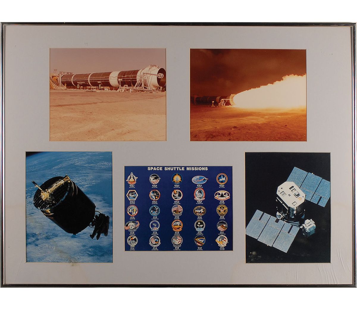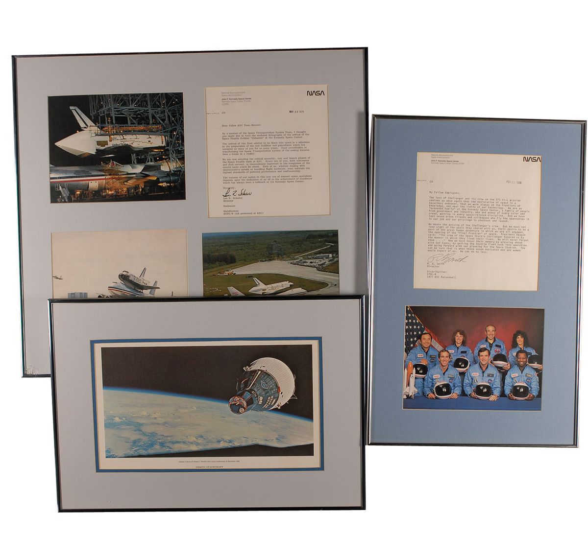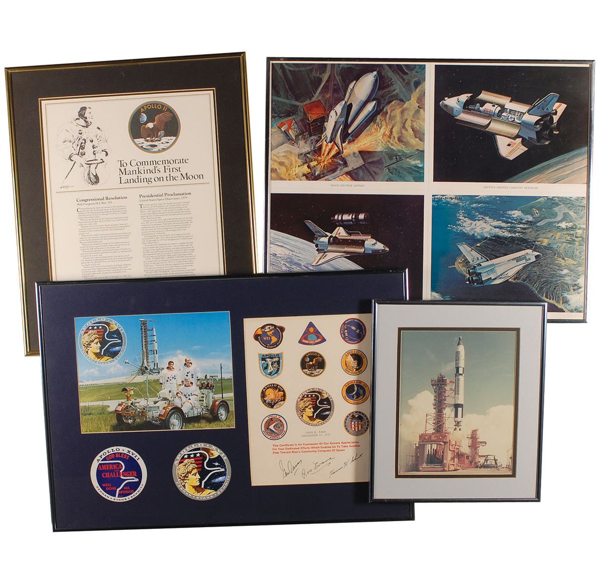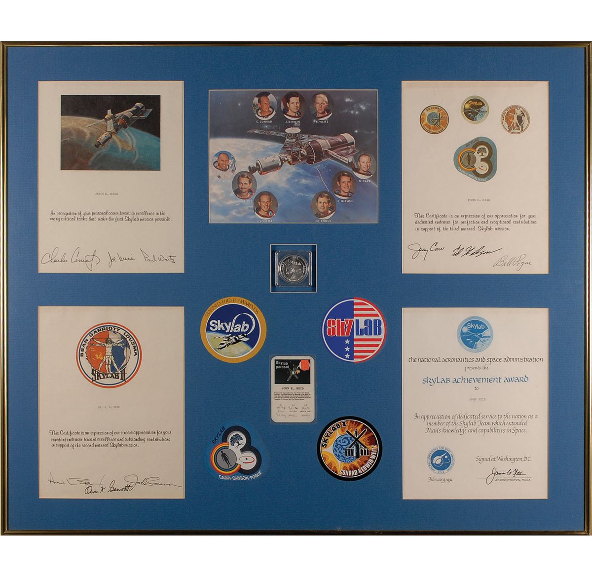 Remainder of the items are housed in 23 individually frames of various sizes and include unsigned photos, NASA letters and memos (with printed signatures), and assorted commendations and certificates of appreciation (also with printed signatures). Some of the items include: a February 11, 1986, memo from Director R. G. Smith sent out after the Challenger explosion; a large display with a color image of Snoopy and a humorous certificate stating Reid is “certified to apply sealant to Skylab nose cones and subject the said sealant to a water test just prior to launch”; printed certificates in appreciation of Reid’s work on all the Skylab missions, a medallion, and a small swatch of unflown Skylab parasol; a letter from the Skylab I crew; a memo which accompanied an Apollo 8 medallion; an original ink and watercolor sketch of Buck Rogers, signed and inscribed to Reid in pencil by artist Rick Yager; Reid’s 1988 retirement certificate; and a composite photo of various launches and landing and Kennedy Space center, signed by Reid’s co-workers upon his retirement. In very good to fine overall condition. Please note: due to the size and quantity of the items in this collection, additional shipping costs will be necessary and are the responsibility of the winning bidder.