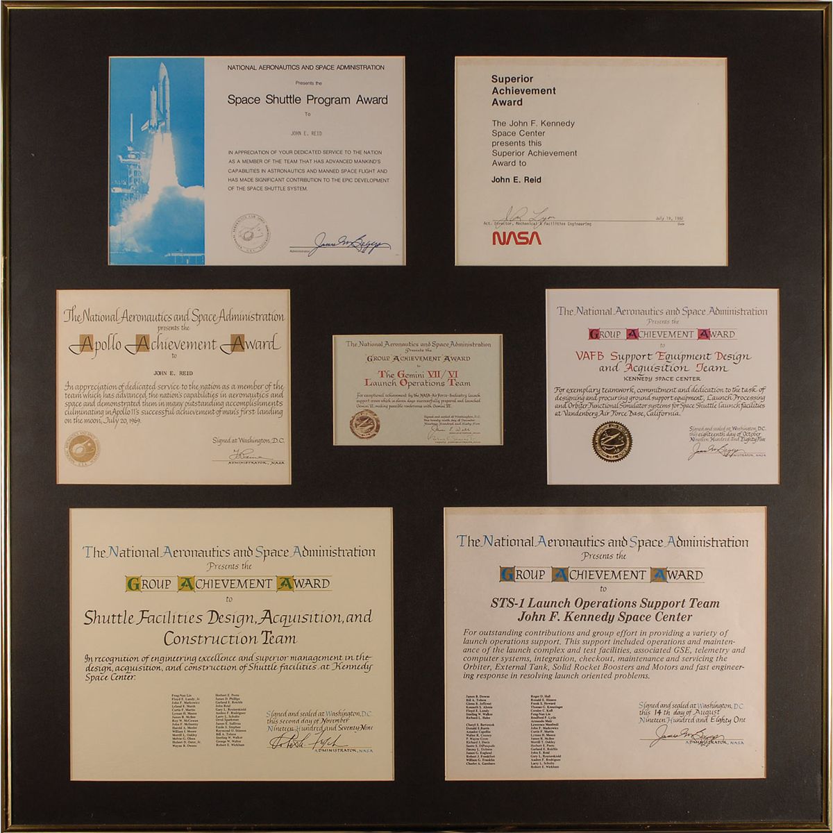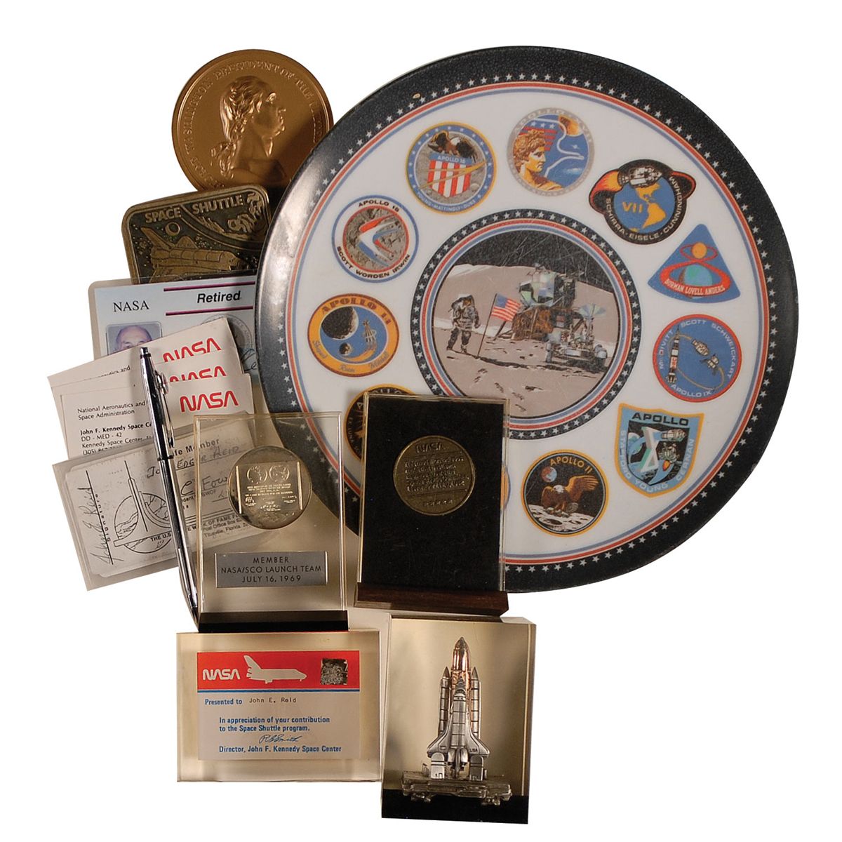 A large collection of items originally owned by retired longtime NASA engineer John Reid. Personal items include: Reed’s NASA Manned Spacecraft Center hard helmet; his Kennedy Space Center identification card, marked ‘Retired’ at the top; one of his NASA mechanical pencils, a presentation medallion given to Reid as a member of the NASA/SCO Launch Team, July 16, 1969; a 25th anniversary presentation medallion; as well as a small square of shuttle heat shield, presented to Reid and housed in a small Lucite square.