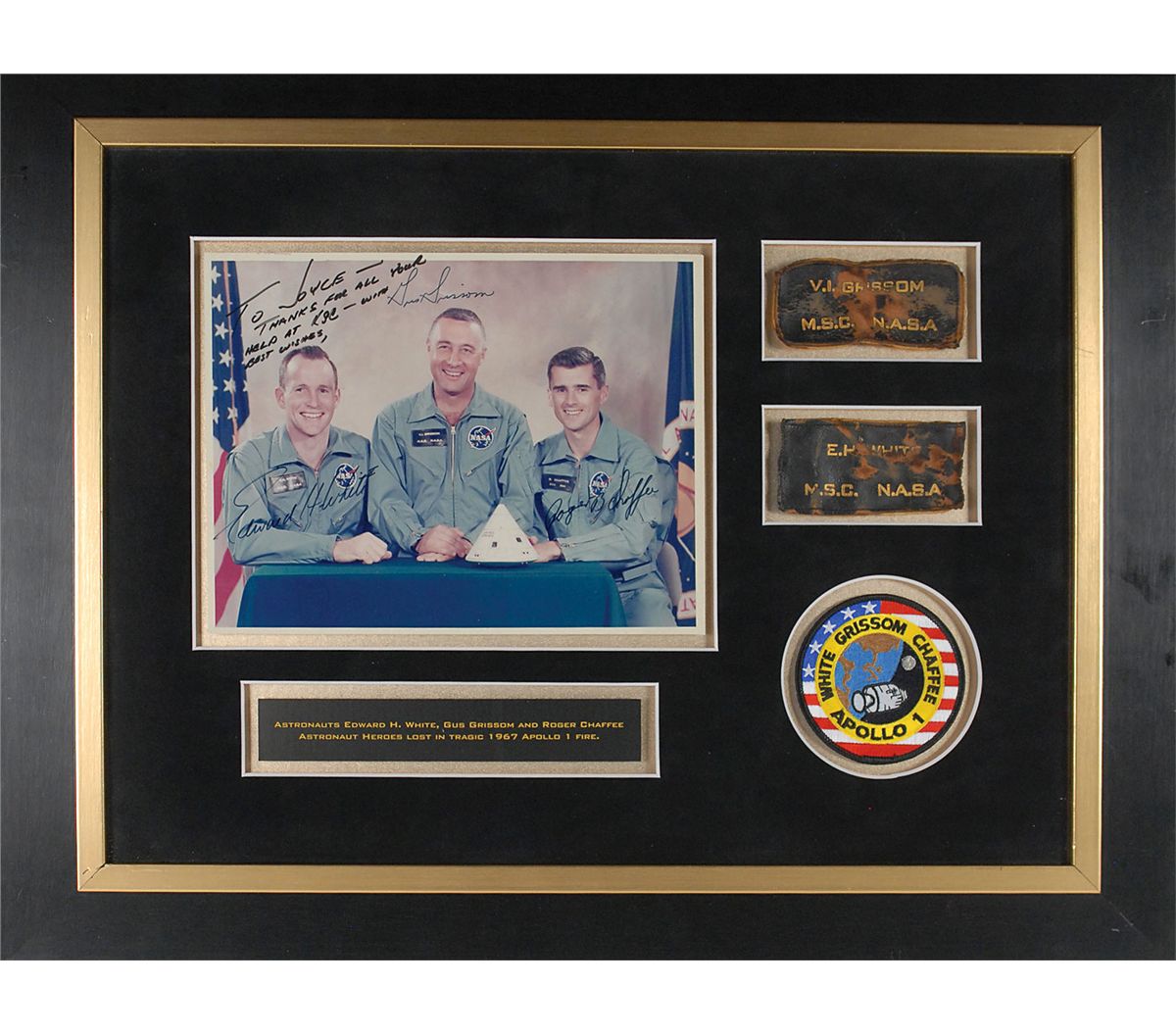 The gem of the collection, without a doubt, is an extremely rare color semi-glossy official ‘red-numbered’ NASA photo, trimmed to a size of 9.75 x 7.5, inscribed in black felt tip in an unknown hand, “To Joyce—Thanks for all your help at KSC—with best wishes,” and signed in black felt tip, “Gus Grissom,” “Edward H. White II,” and “Roger B. Chaffee.” The photo is nicely presented with an Apollo 1 commemorative patch, and leather NASA identification tags of White and Grissom, both of which are moderately to heavily worn. Only a very limited number of these ‘red-numbered’ photos are known to exist, and are rarely available for sale.