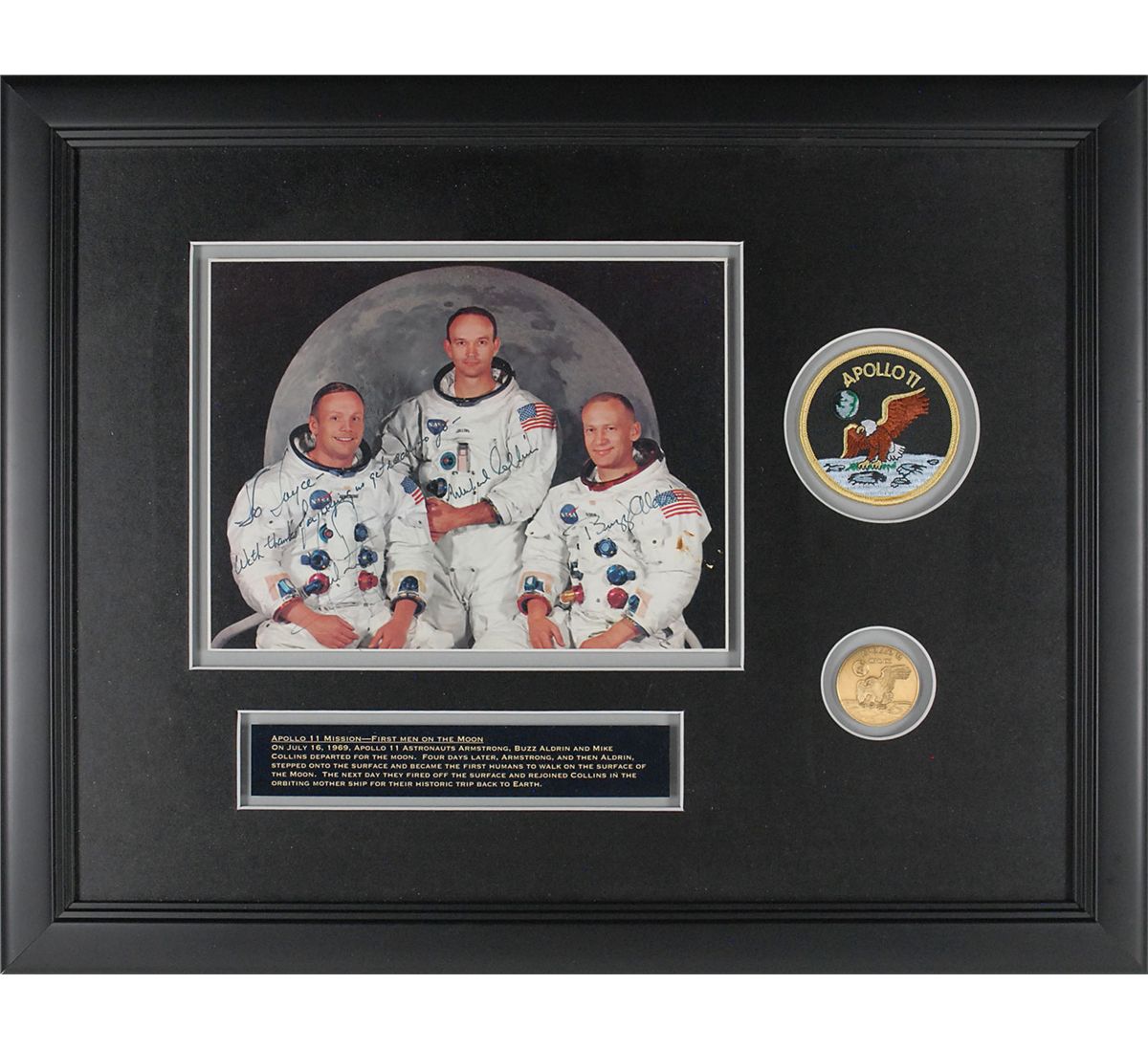 - An always desirable color official NASA litho of the prime crew of Apollo 11 posing in their white space suits, trimmed to a size of 9.5 x 7, signed and inscribed in black felt tip, “To Joyce—With thanks for helping us get ready to go—Neil Armstrong,” “Michael Collins,” and “Buzz Aldrin.”