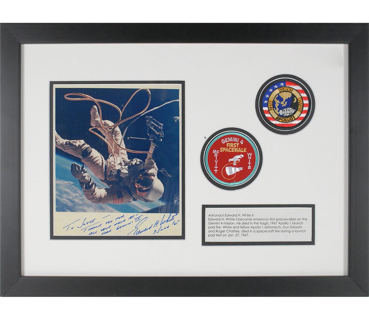 - A fantastic and scarce color semi-glossy 8 x 10 NASA photo of Edward White in the middle of his historic space walk, signed and inscribed in the in lower border blue felt tip, “To Joyce—Thank you for all your help before Gemini IV, Edward H. White II, 3 June ’65.”