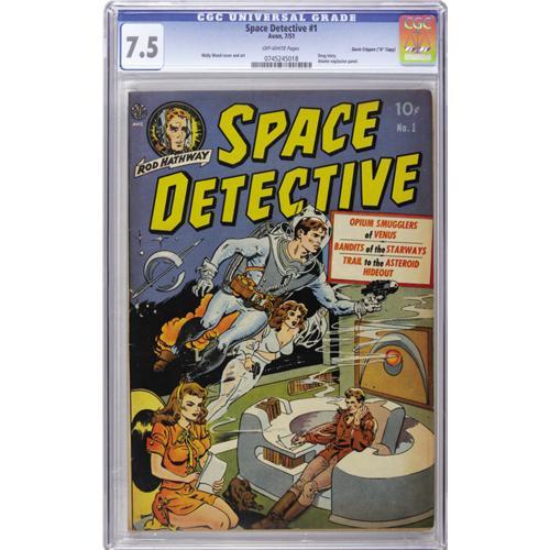<B>Space Detective #1 Davis Crippen ("D" Copy) pedigree (Avon, 1951) CGC VF- 7.5 Off-white pages.</B></I> "Space sexy" as you like it on this cover from Wally Wood, who also contributed art for three interior stories and an incredible 23 pages! We're dying to read "Opium Smugglers of Venus!" Overstreet 2006 VF 8.0 value = $694. CGC census 9/06: 2 in 7.5, 3 higher. <I>From the Crippen Collection</B></I>.<BR><BR><b>Shipping:</b> Slabbed Comic (<a target="_blank" href="http://www.heritageauctions.com/common/shipping.php">view shipping information</a>)