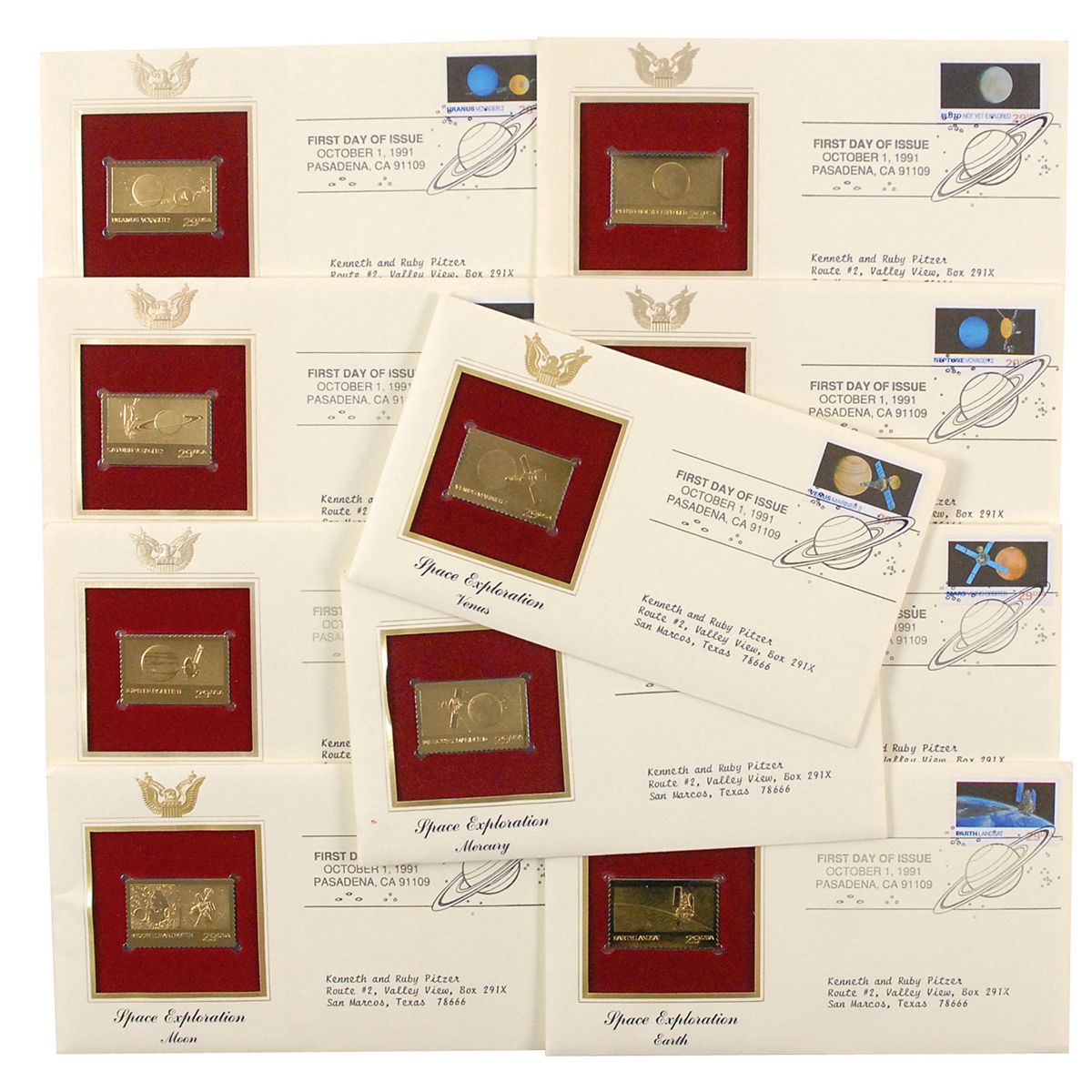 Collection of ten FDCs from the 1991 ‘Space Exploration’ series, all featuring 22-karat gold replicas of the stamps set against a red velvet backing. The series honors the exploration of all nine planets and the moon, including: Mercury (Mariner 10), Venus (Mariner 2), Earth (Landsat), Moon (Lunar Orbiter), Mars (Viking Orbiter), Jupiter (Pioneer 11), Saturn (Voyager 2), Uranus (Voyager 2), Neptune (Voyager 2), and Pluto (not yet explored). In overall fine condition.