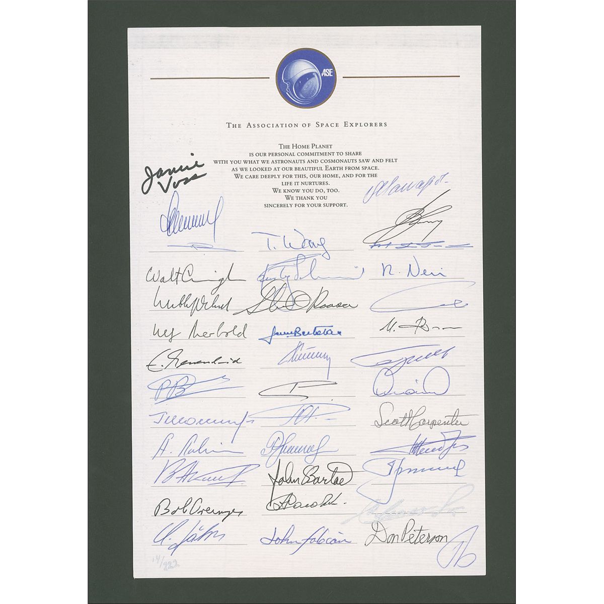 Signed book: The Home Planet. Limited edition. Moscow: Mir Publishers, 1988. Hardcover with dustjacket, 10.5 x 14.25, 147 pages. Signed on a limited edition bookplate, #14/222, in ink and felt tip by 37 astronauts and cosmonauts including: Scott Carpenter, Alexei Leonov, Walt Cunningham, Gherman Titov, Stu Roosa, Rusty Schweickart, Mohammed Faris, and Don Peterson. In fine condition.