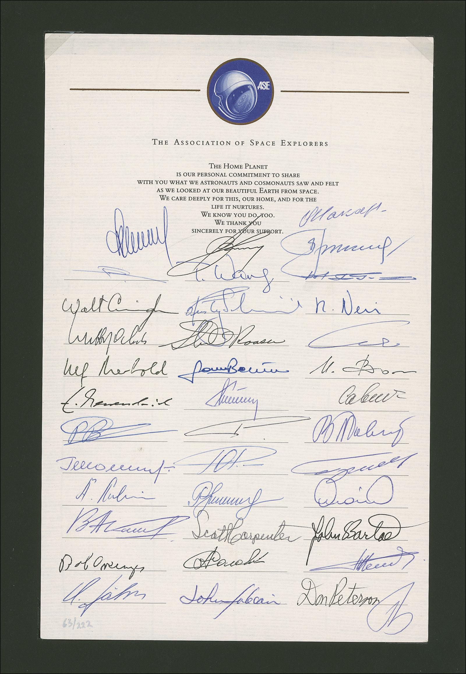 Signed book: The Home Planet. Limited edition #63/222, Massachusetts: Addison-Wesley, 1988. Hardcover with dustjacket, 10.5 x 14.5. Signed on an 8 x 12.5 presentation sheet removably affixed by its corners to the first free end page by 38 astronauts: Scott Carpenter, Walt Cunningham, Stu Roosa, Rusty Schweikart, John-David Bartoe, John Fabian, Vladimir Aksyonov, Vladimir Kovalyonok, Oleg Makarov, Valeri Rozhdestvensky, Vitaly Sevastianov, German Titov, Sultan Al-Saud, Ernst Messerschmid, Alexander Alexandrov, Zhugderdemidiyn Gurragchaa, Sigmund Jaehn, Bob Overmyer, Yuri Glazkov, Aleksander Laveykin, Nikolai Rukavishnikov, Georgi Shonin, Igor Volk, Patrick Baudry, Rodolfo Neri-Vela, Mohammed Faris, Georgi Ivanov, Dumitru-Dorin Prunariu, Don Peterson, Taylor Wang, Georgi Grechko, Alexei Leonov, Yuri Romanenko, Svetlana Savitskaya, Anatoli Soloviyov, Boris Yegorov, Ulf Merbold, Wubbo Ockels, and Bertalan Farkas. In fine condition, with light wear and creasing to the dustjacket..