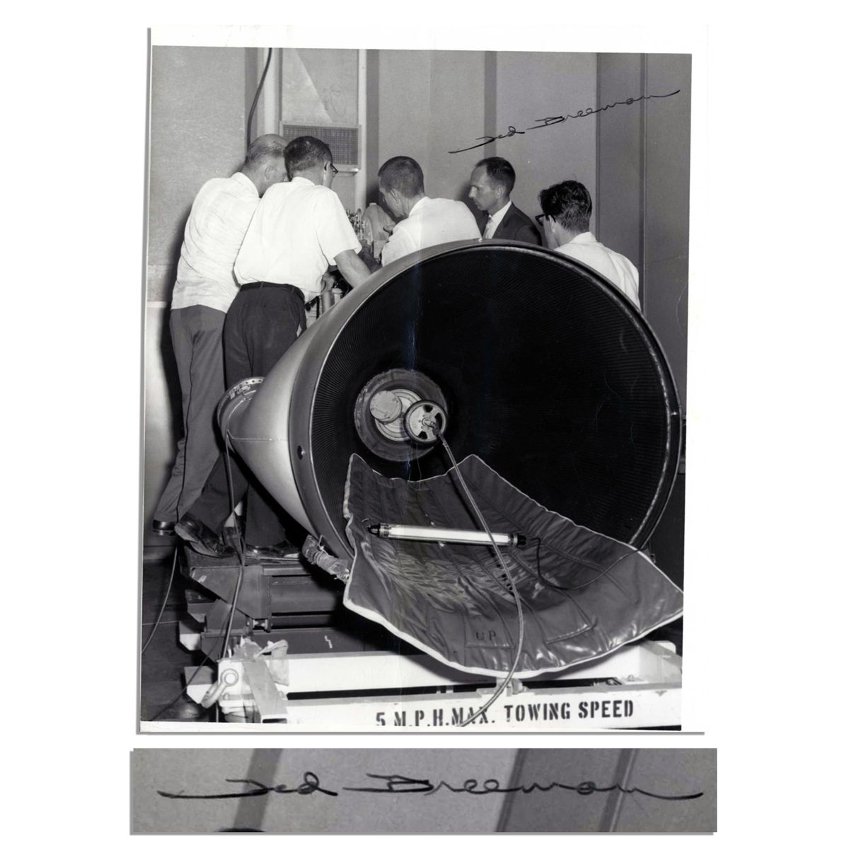 American flag flown in space on NASA's STS-2 mission. On 12 November 1981 from Kennedy Space Center, the Space Shuttle Columbia launched its record-breaking mission as the very first orbital manned spacecraft to complete a second flight. Its crew, Joe Engle and Richard H. Truly were considered rookie astronauts, but landed safely two days later at Edwards Air Force Base. Flag measures 6'' x 4.25'' and comes mounted to an official NASA certificate featuring color photos of Columbia, mission insignia and a printed dedication to Donald A. Scoville. Measures 8.5'' x 11'' overall. Toning to adhesive on flag, else near fine.
