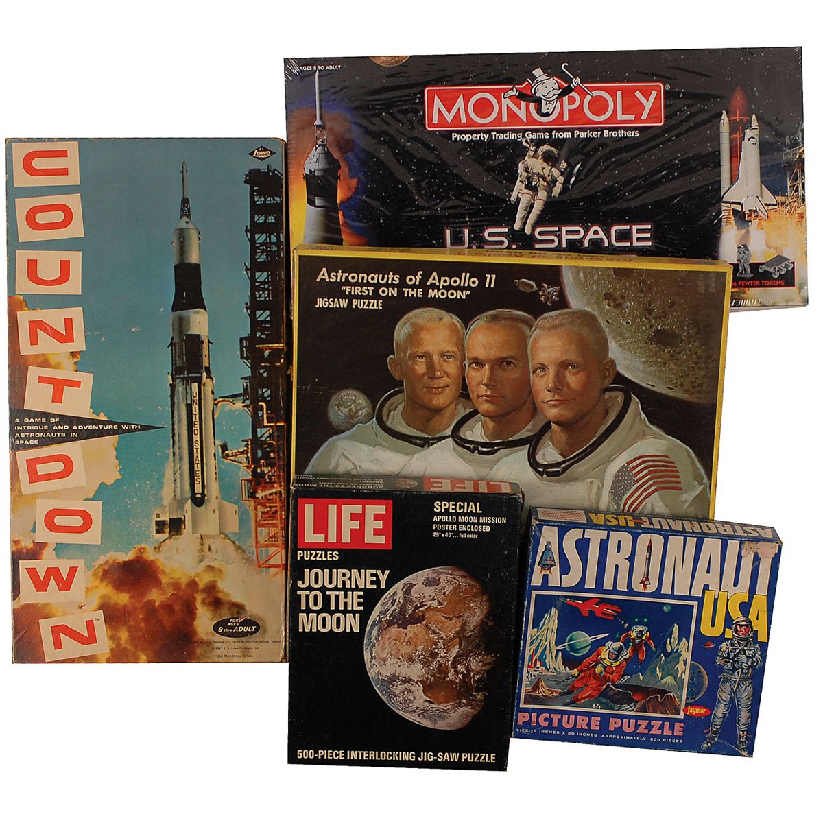 Five board games and puzzles: one Milton Bradley ‘Astronauts of Apollo 11: First on the Moon’ 500-piece jigsaw puzzle, depicting Neil Armstrong, Buzz Aldrin, and Michael Collins on the box cover; one Life Magazine ‘Journey to the Moon’ 500-piece jigsaw puzzle (not accompanied by original poster); one Jaymar ‘Astronaut Landing’ 600-piece jigsaw puzzle; one E. S. Lowe ‘Countdown: The Adventure-in-Space Game’ board game; and one unopened Parker Brothers ‘Monopoly: US Space Edition’ board game. In overall very good condition, with pricing labels affixed to most and some separation to box corners.
