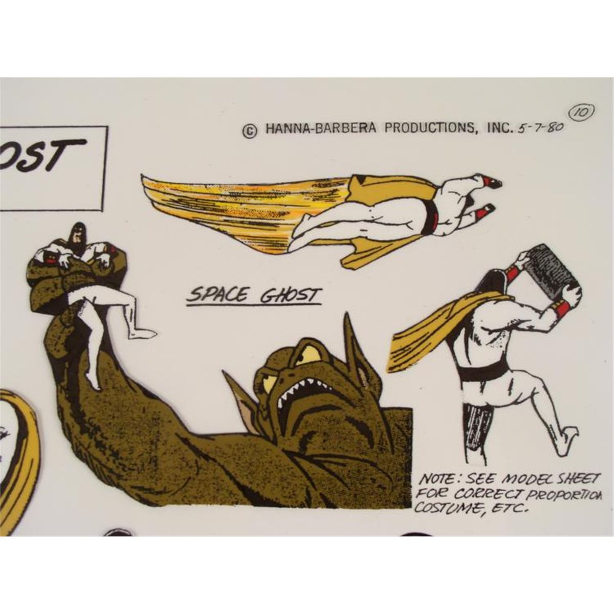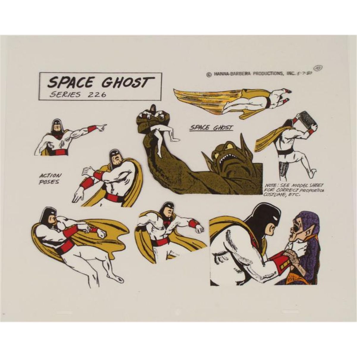 This is an original production animation model cel from the television show "Space Stars" featuring Space Ghost. Here we see 8 different action images of Space Ghost, including one of him grabbing a villain, and one of a giant villain grabbing him! * In his original incarnation, Space Ghost was a superhero who, with his sidekick teen helpers Jan, Jace, and Blip the monkey, fought supervillains in outer space. Space Ghost often came to the aid of The Herculoids and vice versa. They also frequently crossed paths with the Teen Force. * * Original Animated Cel, hand-painted, with peg holes along the bottom edge Overall Size of the Cel: 10 1/2" x 12 1/2" Title: "Action Poses"Date: 5-7-1980Series: 226 * Excellent Condition -ready to be matted and framedThis is an original cel used in production. Each one-of-a-kind set-up represents a slight change in position of the characters. When individually photographed and projected in rapid succession, the images appear to move. * To create production cels, the original animator's drawing is transferred onto an acetate cel (by hand-inking and/or photo copying). The cel is then hand-painted on the reverse side. * * *