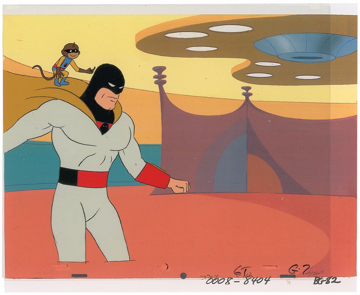 (Hanna-Barbera Studios, circa 1980s) Original production drawing and matching production cel featuring Space Ghost, with the cel also featuring his sidekick Blip the Monkey. Drawing is accomplished in graphite on untrimmed 12.5 x 10.5 animation paper, and cel is placed on a color copy background. Image measures 7 x 8.5, with overall dimensions of 13.5 x 11. In fine condition.