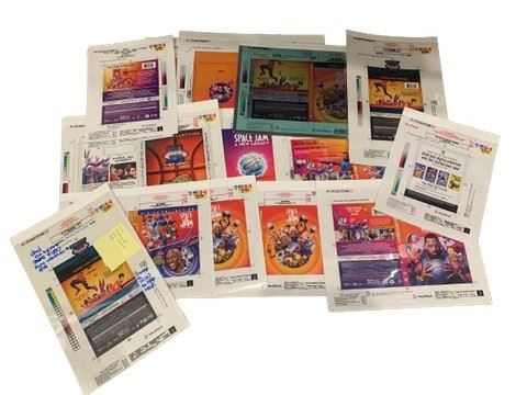 A collection of the movie Space Jam's artwork proofs for studio approval from the year 2021. Includes the rear panel of the target exclusive Tipon, The two film collection DVD sleeve, the steel book Tipom with studio notes, The Blu-ray rap design, the target exclusive sweet gift box with die cut window opening, the DVD sleeve, another Blu-ray sleeve, the 4K HD plus Blu-ray sleeve, and the BD wrap for the Blu-ray sleeve.