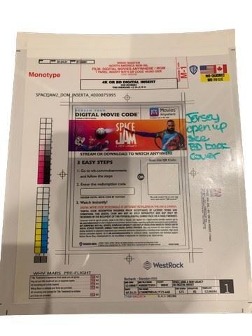 A collection of Space Jam artwork proofs for studio approval from 2021. In this lot there are proofs for space jam a new Legacy movie target exclusive art cards featuring LeBron James on the cover, another art card featuring Tweetie on the cover, another featuring Daffy duck on the cover and another featuring Bugs Bunny and Speedy Gonzalez on the cover. Also included is the digital insert for the DVD with notes from the studio and the DVD sleeve with notes from the studio.