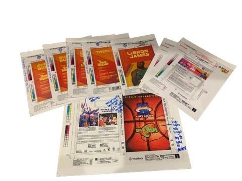 A collection of Space Jam artwork proofs for studio approval from 2021. In this lot there are proofs for space jam a new Legacy movie target exclusive art cards featuring LeBron James on the cover, another art card featuring Tweetie on the cover, another featuring Daffy duck on the cover and another featuring Bugs Bunny and Speedy Gonzalez on the cover. Also included is the digital insert for the DVD with notes from the studio and the DVD sleeve with notes from the studio.