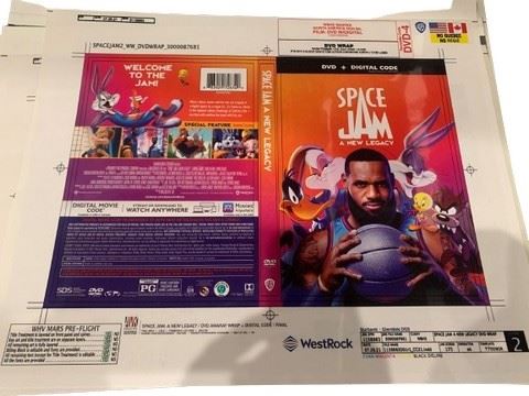 A collection of the movie Space Jam's artwork proofs for studio approval from the year 2021. Includes the rear panel of the target exclusive Tipon, The two film collection DVD sleeve, the steel book Tipom with studio notes, The Blu-ray rap design, the target exclusive sweet gift box with die cut window opening, the DVD sleeve, another Blu-ray sleeve, the 4K HD plus Blu-ray sleeve, and the BD wrap for the Blu-ray sleeve.