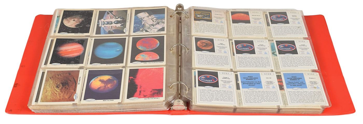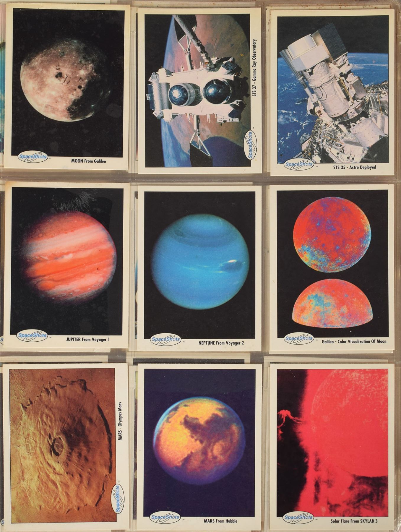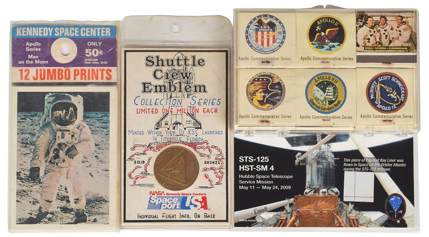 Group lot of unsigned items honoring various NASA programs and events, including: a laminated 1 x 1 swatch of payload bay liner flown on STS–125; appealing RCA Apollo Commemorative Series of twelve commemorative matchbooks, numbered 09133, honoring missions 8–17, with a Presidential matchbook showing the portraits of Kennedy, Johnson, and Nixon; a bronze Space Port USA medallion from the Shuttle Crew Emblem collection series, honoring the Kennedy Space Center, with raised design of the space shuttle logo on the front, and the reverse showing the shuttle in space encircled with raised text, “The New Era of Space Exploration”; an official color NASA lithograph of the STS-107 crew, plus an STS-107 decal; an unopened set of 12 jumbo prints from the Apollo–Man on the Moon series, each 3.5 x 4.75, made by Promotions Original Products; and a collection of SpaceShots trading cards from Series 1–3, including cards 1 through 330, with card 51 missing, all of which are housed in a three-ring binder. In overall fine condition.