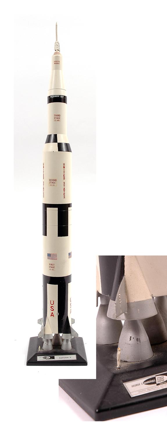Space Models, NASA "Saturn V" Model (22x2.5") This black, white and red NASA Marshall Graphic Engineering and Model Shop model consists of a one piece model mounted on a 4" square base with a "man" figure for scale in one corner alongside a medal "Marshall Center "Saturn V" metal label. Each stage of the rocket is identified with an original red add-on ID decal. Other than a minor corner fault at the bottom of the escape tower at top and light ageing, the model is in excellent overall condition.