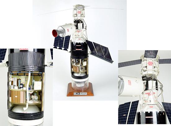 Space Models, NASA "Skylab" Model (26x24") This striking NASA 1:48 scale model is mounted on a square wooden base with a George C. Marshall Space Flight Center/Graphic Engineering and Models Division metal ID plate on one side and with a "MSFC#77283 ID tag on the other. The model is complete with two Solar Array Wings" and four individual "Solar Panels" in addition to an individual Command and Service Module attachment. All of the pieces are mounted in a custom, padded and fitted, foam shipping container with Marshall transit labels still attached. Other than some of the normal aging on the clear lucite base of the model and a minor flaw or two, it is in unually clean, complete condition. Of particular interest is the original 1975 NASA purchase order paperwork transfering ownership of the model from NASA/Marshall to North American Rockwell Space Division and a request letter from North American asking to borrow or purchase an example of this model. The original cost of the model is listed by NASA as $784.00 + $35 for the fitted carrying case. Don't you just wish!! This model is a rare find that is not often available.